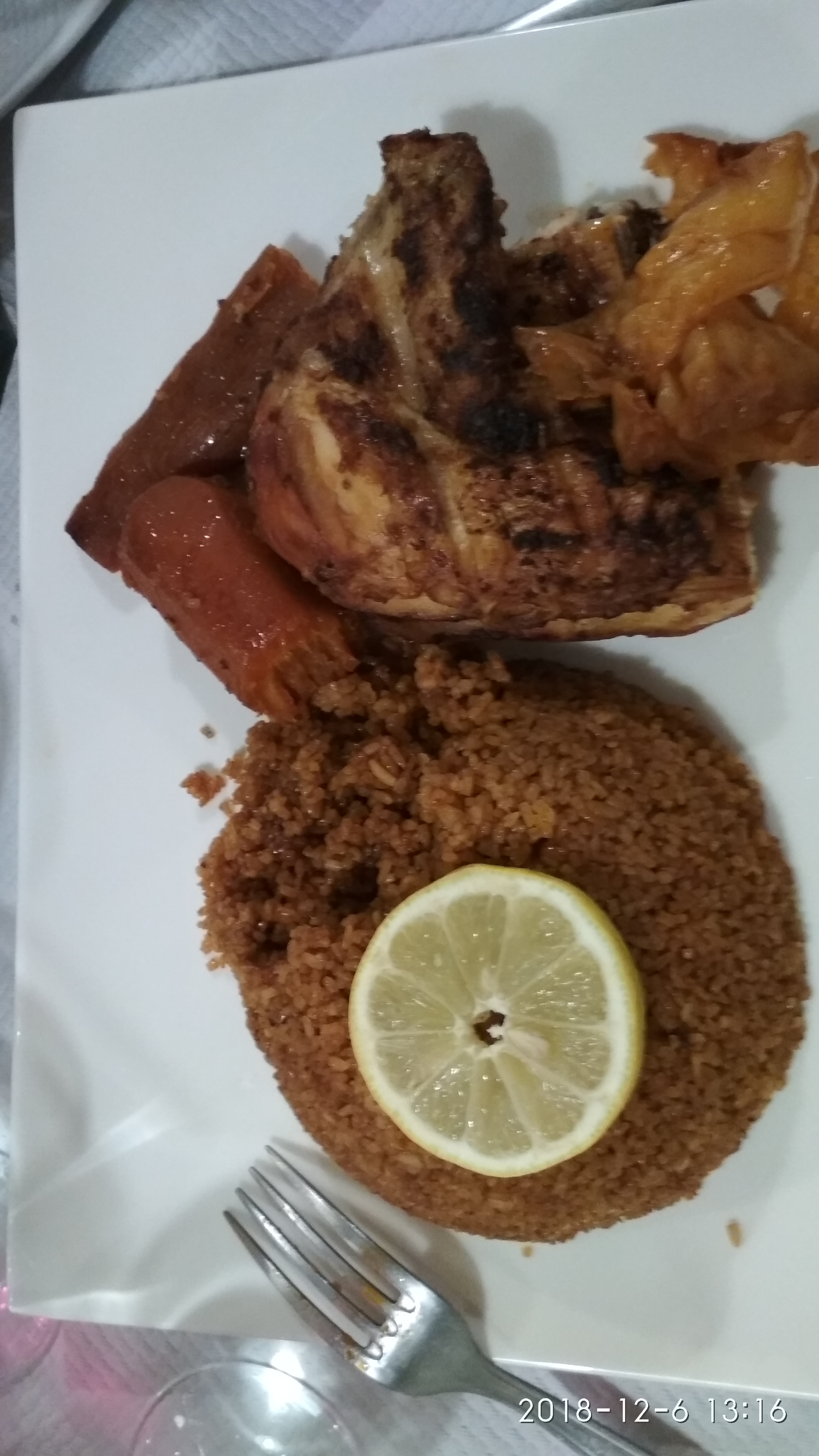 Poisson et agneau grillés savoureux. L'agneau grillé n'a peut-être pas assez de viande autour de l'os, donc ce plat est un hasard. De plus, j'ai commandé via Deliveroo et j'ai reçu l'alloco au lieu des frites comme commandé.