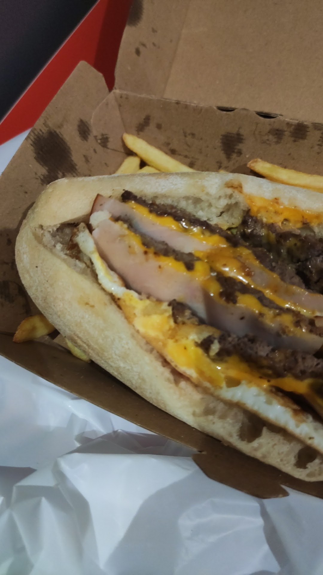 Le sandwich était bon mais les frites n'était pas salé et pleine d'huile... demander à ce que le bac à huile soit changé à chaque service pour éviter les problèmes cités plus haut 😳😏