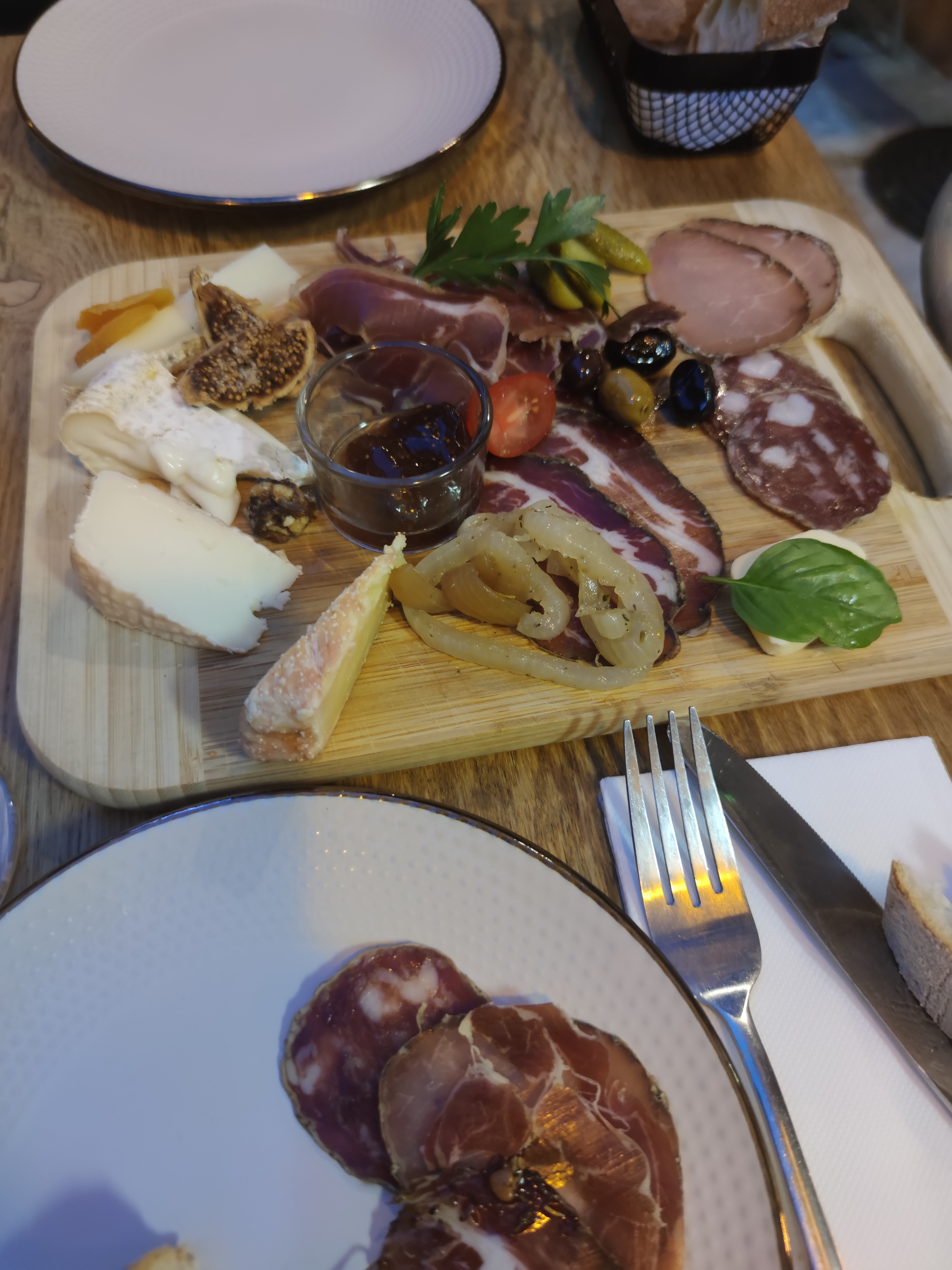 Planche de fromage bien garnie et très bonne. Les sandwichs et tartines sont également très gourmandes ! Vin à l'orange offert à la fin du repas.