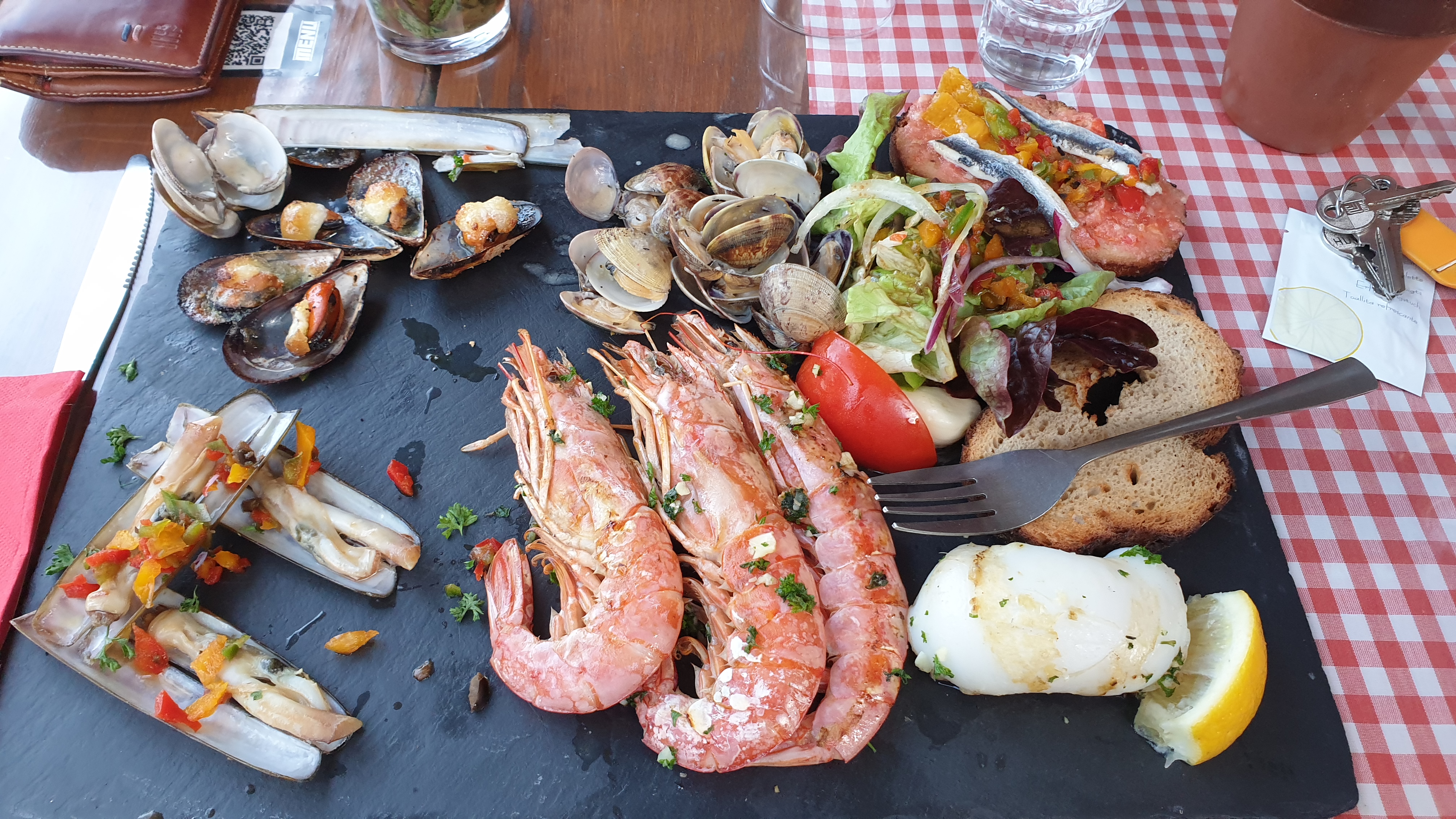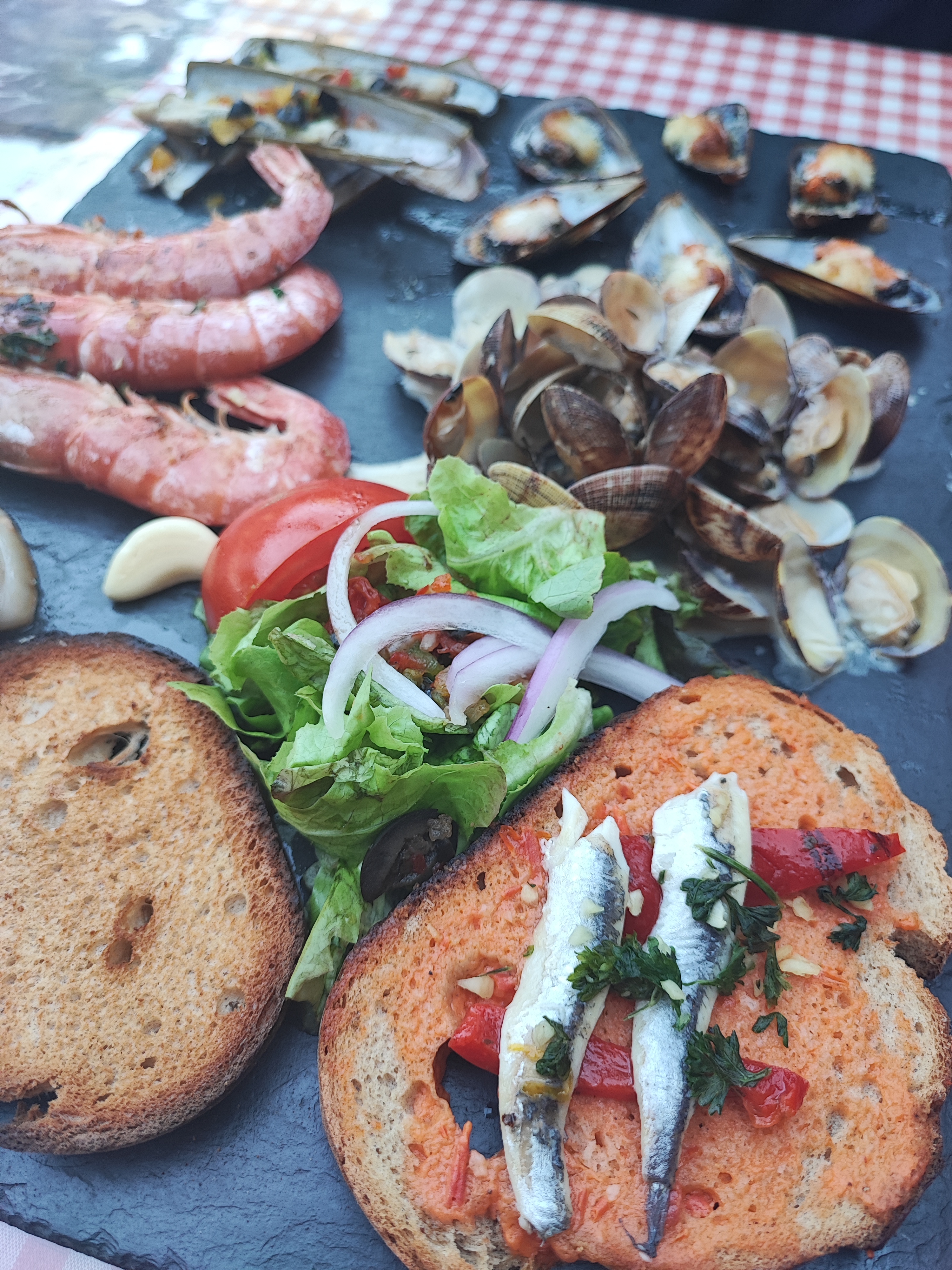 Très agréablement surpris par ce petit resto/bar à tapas du bord de mer... Déjà par son originalité et simplicité de déco (petit salon en palette et coussin devant). Une simplicité qui cache de bon produits frais et locaux ! Le patron est très sympas l accueil chaleureux. On passe au repas... Une carte sur des ardoises murales vous annonce la carte. Car en effet pas de menu. Tapas a gogo et plateaux (ardoises devrais je dire) diverses: de fromages, de la montagne (charcuterie) et de la mer. Nous avons pris 2 ardoises de la mer : couteaux, palourdes/coques gambas a la crème, moules gratinées aïoli, sèches, petite salade, pan con tomate, anchois sur toast.... Un régal!!!! C est copieux c est délicieux et honnêtement très abordable (surtout pour du frais et en bord de mer!). Les enfants ont pris des tapas tout aussi bonnes. Les desserts sont maison également. Si nous passons par la nous reviendrons c est sûr!! (2 jours avant nous nous étions fait racoller sur la marina et avions mangé dans un resto qui était bien plus cher et où je doute que tout était maison et frais! Donc je recommande cette adresse sûre et agréable.