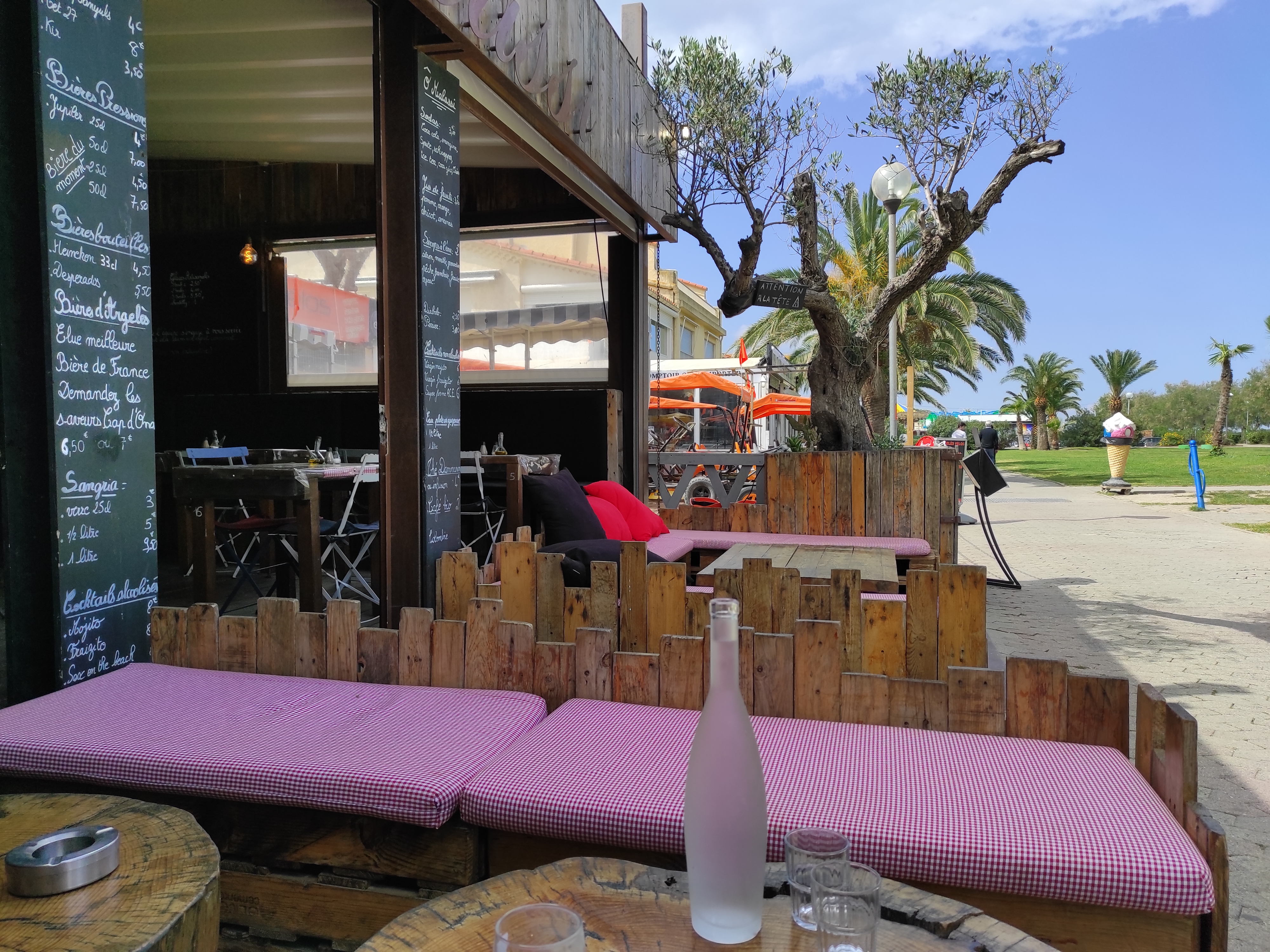 Contrairement au nom de l'établissement, on est bien assis et avec la mer à proximité. Un bon petit morijto, pour ma part, une goutte de rhum supplémentaire n'aurait pas été de trop. Serveur sympa et le resto type plancha à l'air cool.