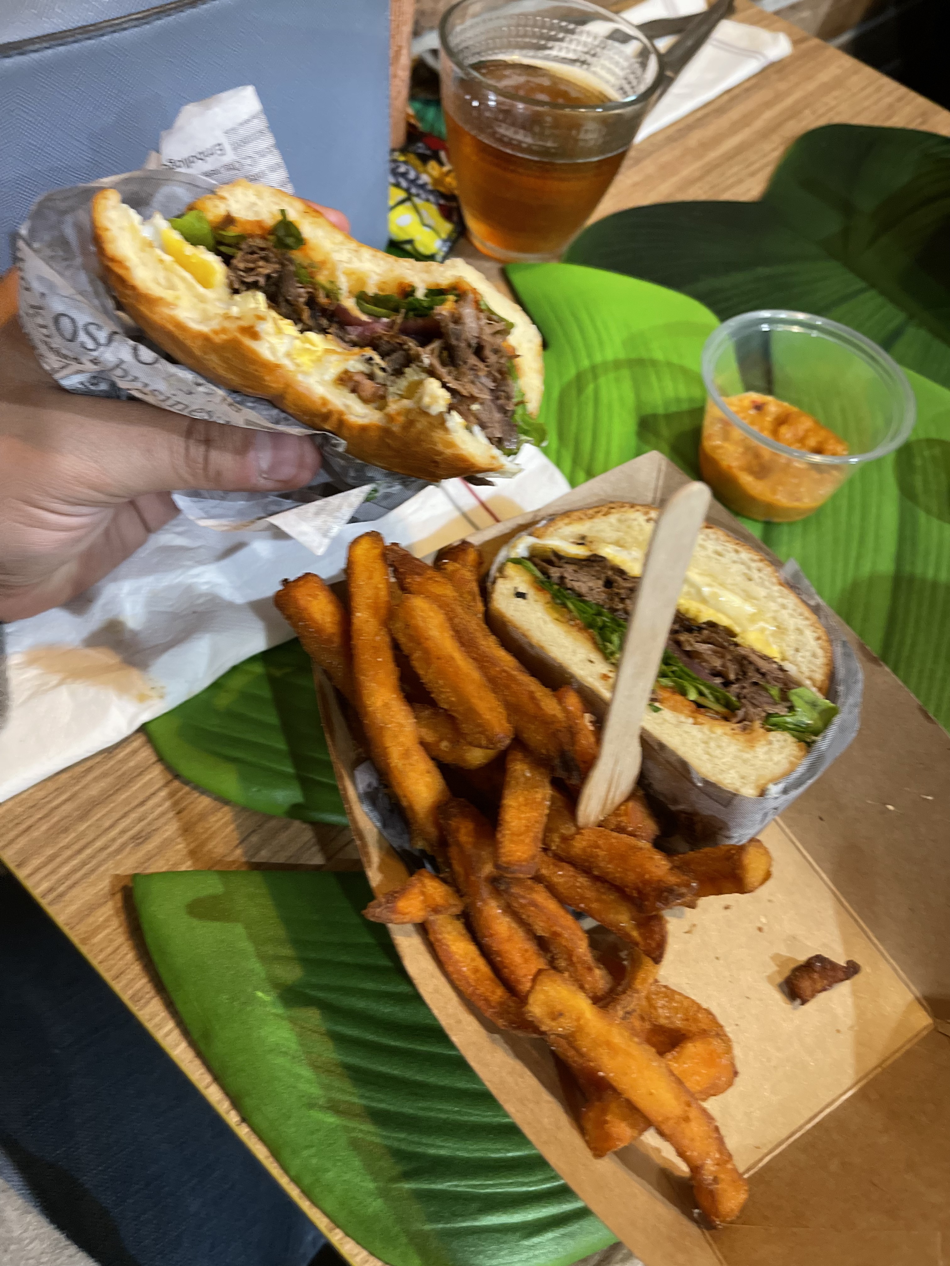Une bonne découverte : burger à l’agneau C’est super bon. Je regrette un petit peu de ne pas prendre des potatos à la place des bananes frites.