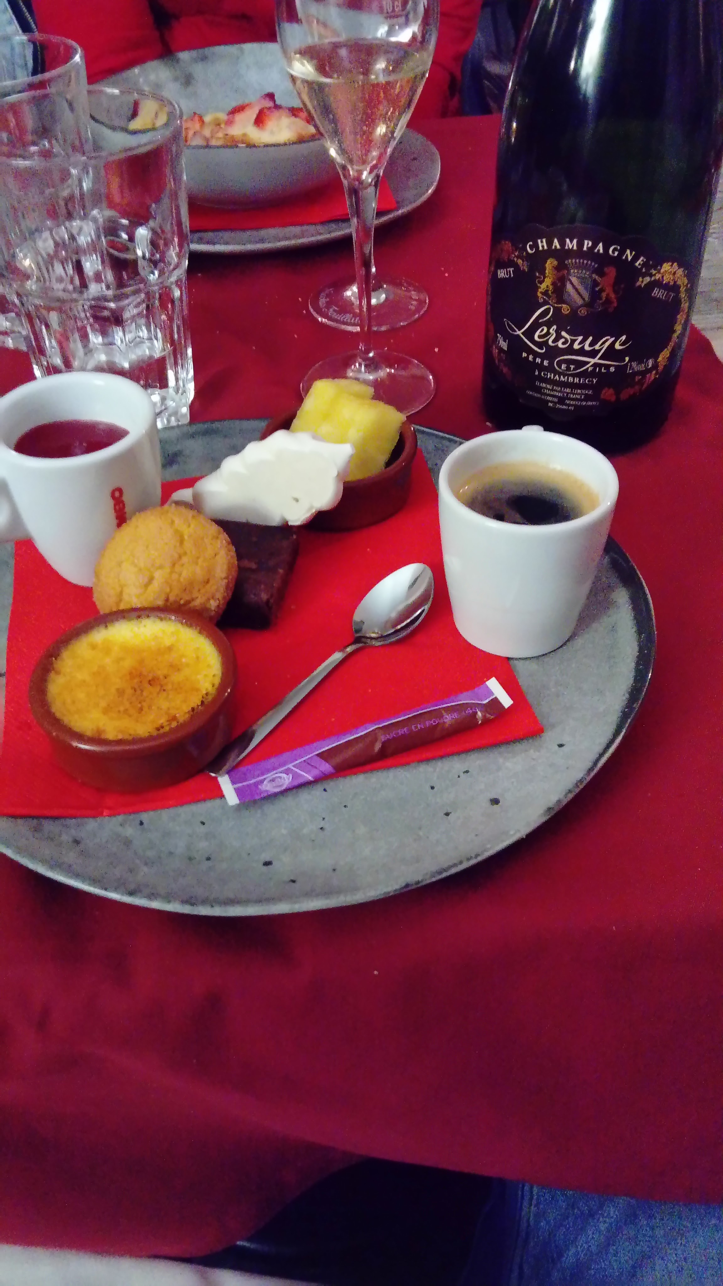 repas en famille à 6 personnes, excellent accueil de la part de Mme, Mr est aux cuisines et y excelle. Le suprême de poulet était délicieux, la purée de carotte avec une touche de cardamome était surprenante. J'ai gouté les rognons qui étaient très bien cuits. Tout ça, c'est gouteux, copieux avec une présentation soignée ! on a eu du plaisir, je recommande