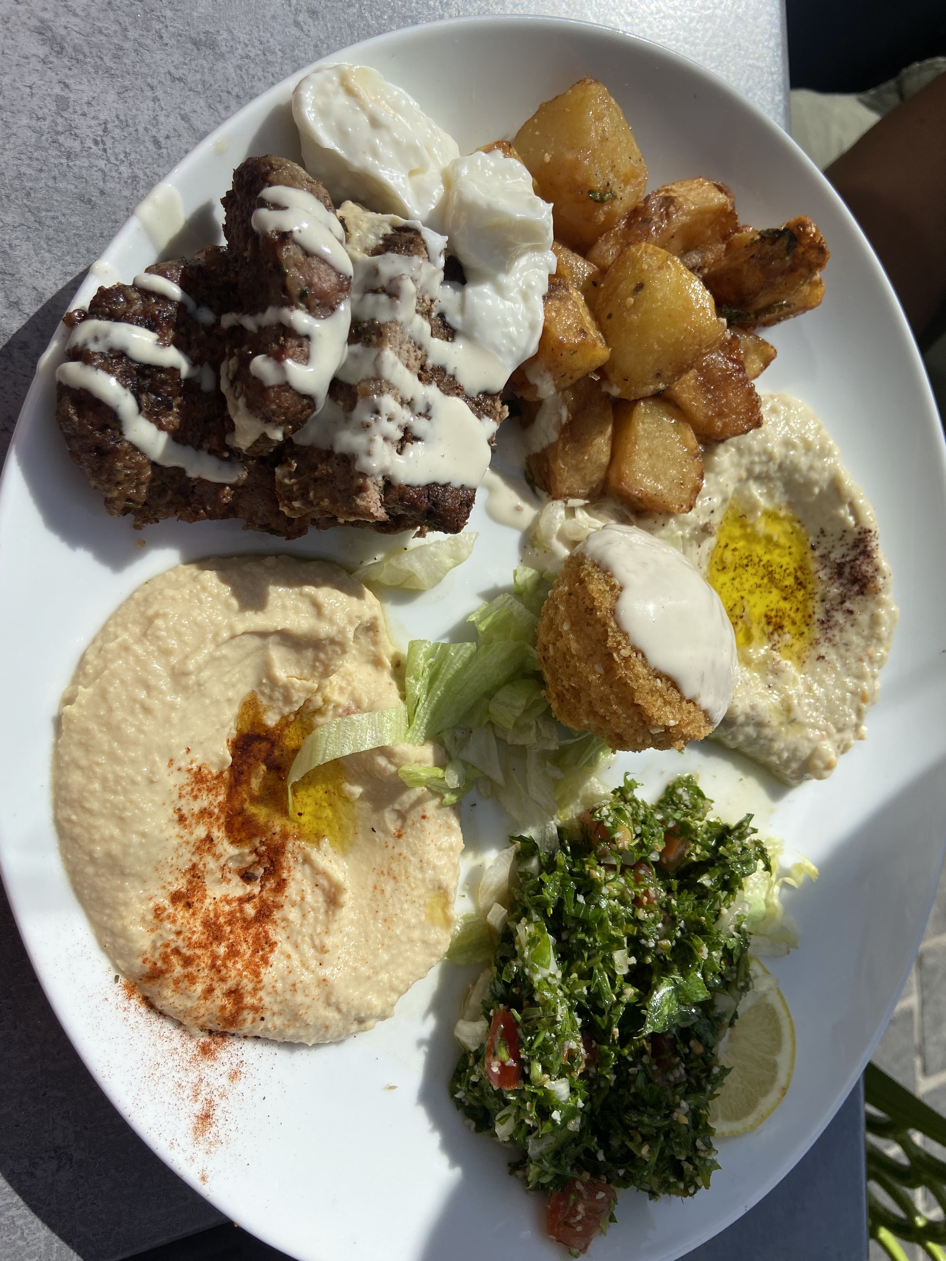 Excellent!!! Ce n’est pas très chère et très bon Sur la terrasse, servis avec l’accueil et le sourire d’une jeune femme très sympa. Tout y était bon sauf ! Le pain, 😥oui et il ne manquait presque que ça . Le vin aurait été bienvenus mais ne pas en vendre est un choix que je comprend dans une petit enseigne. Mais le pain, c’est tellement dommage avec le houmos ...Je préférai presque manger les mezze à la cuillère. je suis peut-être difficile mais Il faut je le dise parce que j’espère bien revenir mais avec un meilleur pain. Je met quand mêmes 5 étoiles parce que Sans ça l’accueil et la nourriture y est très bonne.