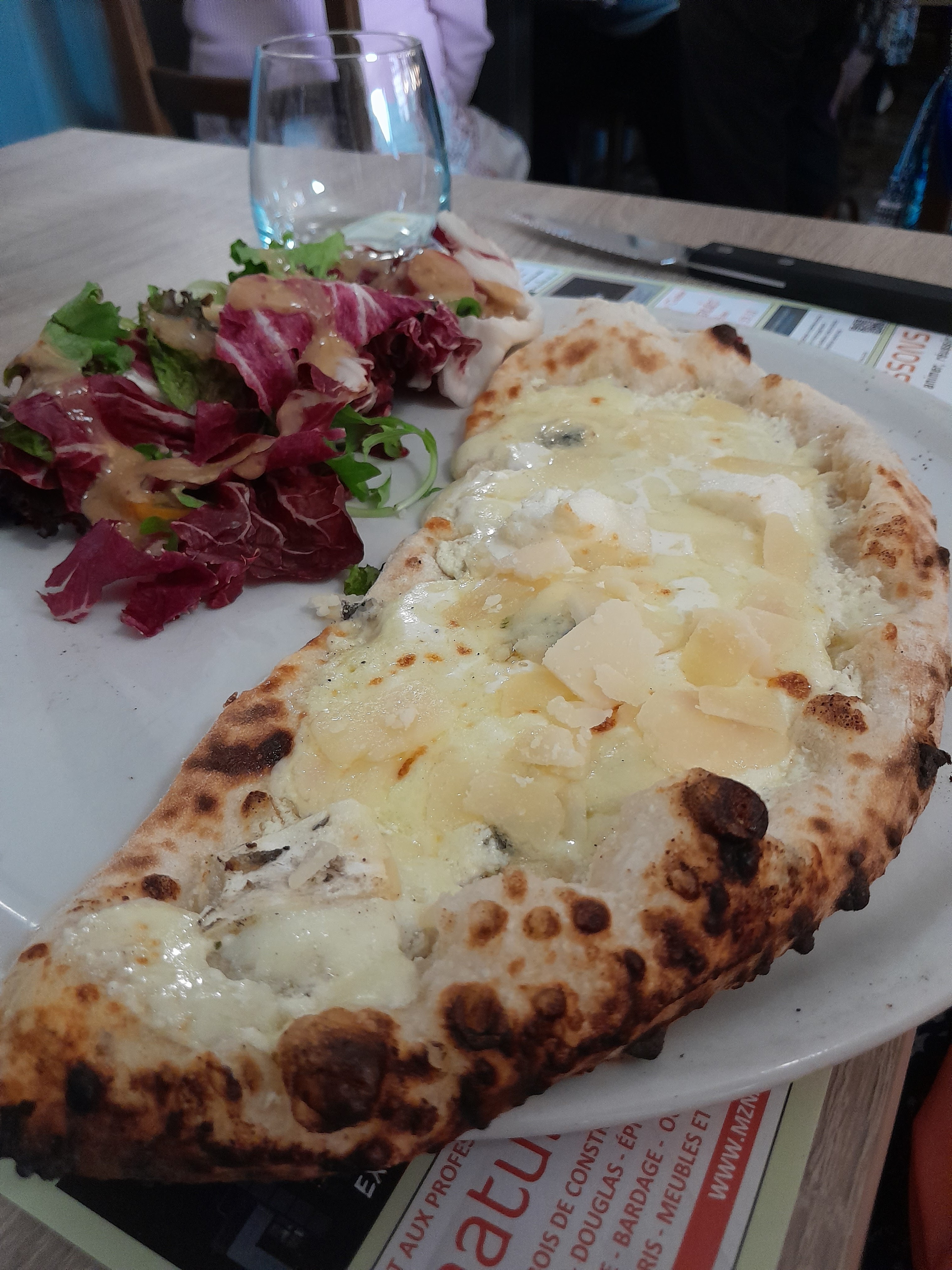 Pizza à emporter ...4 fromages...vraiment déçu pâte très épaisse et pas cuite..garniture fromage la déçu..j'ai cru manger de la pâte pots cuite réduire au moins moitié l'épaisseur de la pâte et la faire cuire...garniture fromage à revoir..dommage pr une pizza au feu de bois.