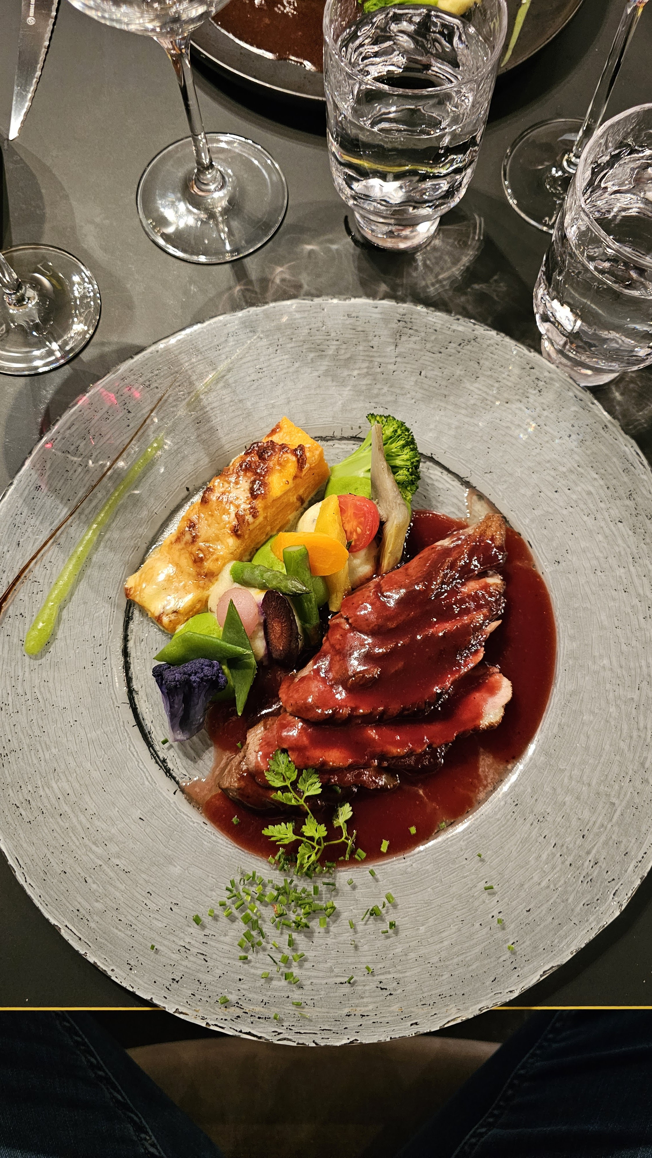 Un régal vraiment. Les entrées des oeufs époisse et meurette un délice. La sauce framboise pour le magret un peu trop en quantité à mon goût et un peu trop sucrée... La viande était parfaite .. Et les Profiteroles les choux étaient un peu trop cuits aussi pour nous. Le finger chocolat une tuerie et une des convives s'est extasiée des gambas et du risotto à la truffe.