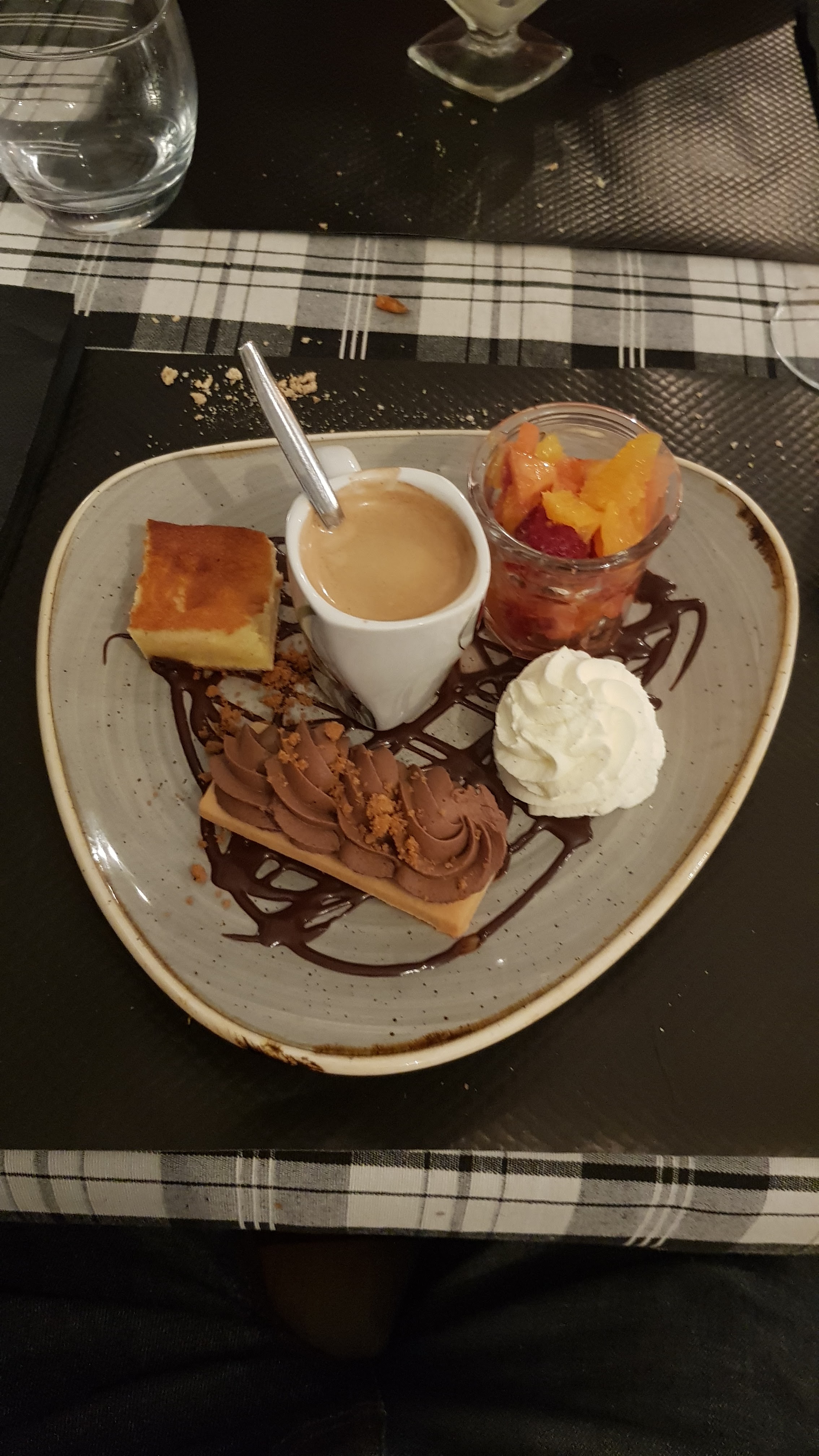 Cadre très sympathique, personnel au service agréable néanmoins la responsable ou patronne très froide, doit être très fatiguée, ne s'intéresse pas a ses clients. Viande trop cuite. Dessert tatin revisité, parfait.