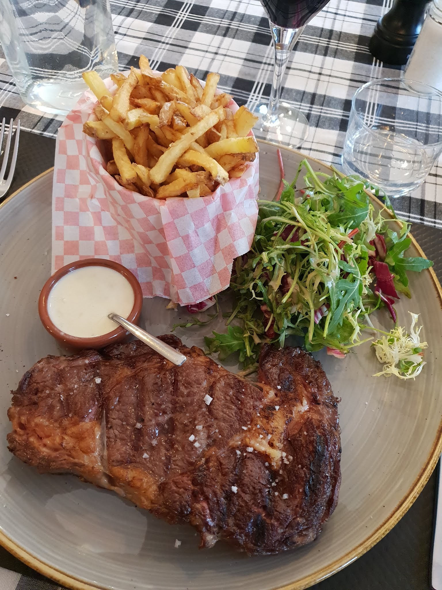 Une HONTE ! Je n'ai jamais été reçue de la sorte dans un restaurant. La serveuse à l'entrée ne me regarde pas, ni bonjour ni rien, alors que j'avais une réservation. Mais que dire de la patronne !!! Elle est passée 3 fois devant moi, sans m'adresser un bonjour, un sourrire, ne serait-ce qu'un regard ! Un délire ! Une chance qu'elle ne se soit pas occupée de notre table. Elle annonce les assiettes dans ses mains comme une poissonnière et ne semble pas maîtriser les codes de la politesse dans le milieu du commerce. De retour dans la région, je souhaitais retourner dans ce restaurant que j'ai très bien connu dans les années 2000, tandis que mes amis ne voulait plus y mettre un pied depuis qu'elle avait testé le comportement de la patronne. Désolée pour eux. Quant à la nourriture, c'était simple et bon. Rien de fou. Les portions de frites un peu mesquines mais un plaisir de manger sur une nappe en tissu.