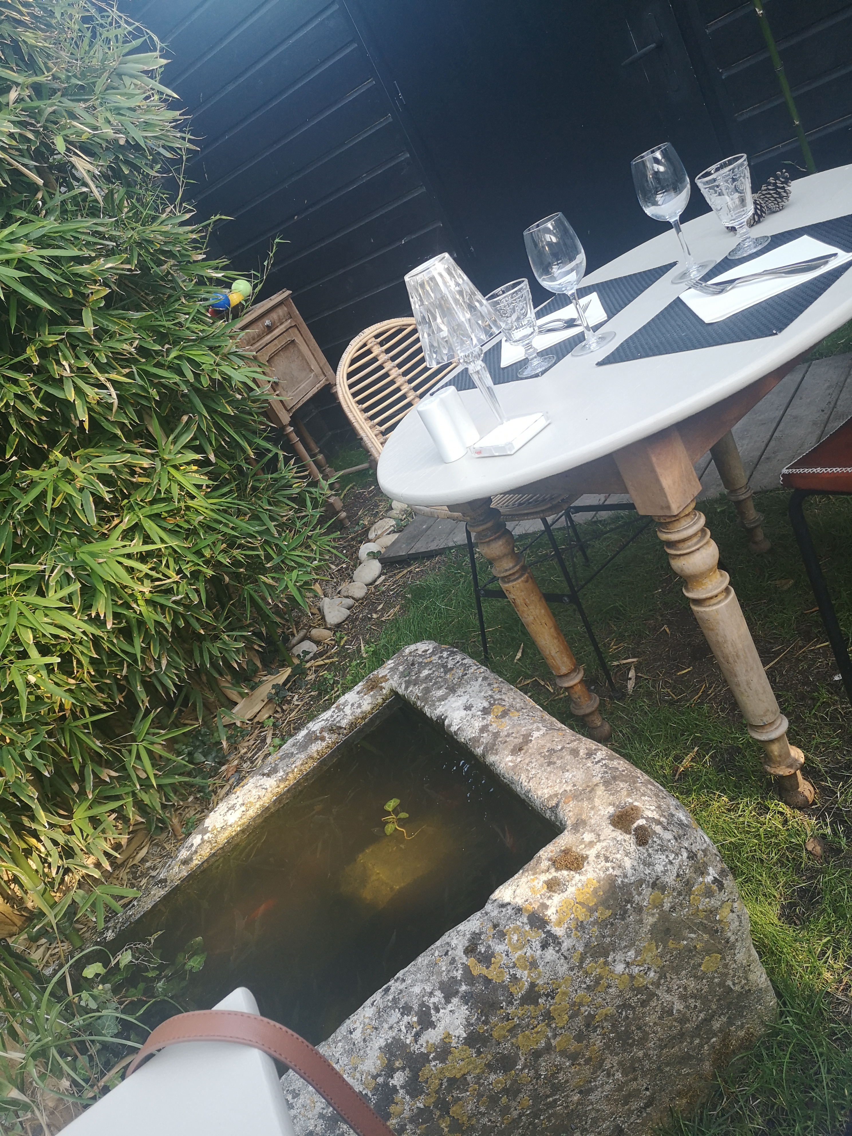 Très bel endroit au calme, beau cadre ou l 'art de la table est mise en valeur. Mélange d 'art et d'objets de brocante. Patron accueillant et serveuses agréable, parfait. Le restaurant n 'était pas plein ce midi là, donc service détendu. Tout les plats que nous avons goûtés étaient excellent. Les chèques vacances de type ANCV sont acceptés.
