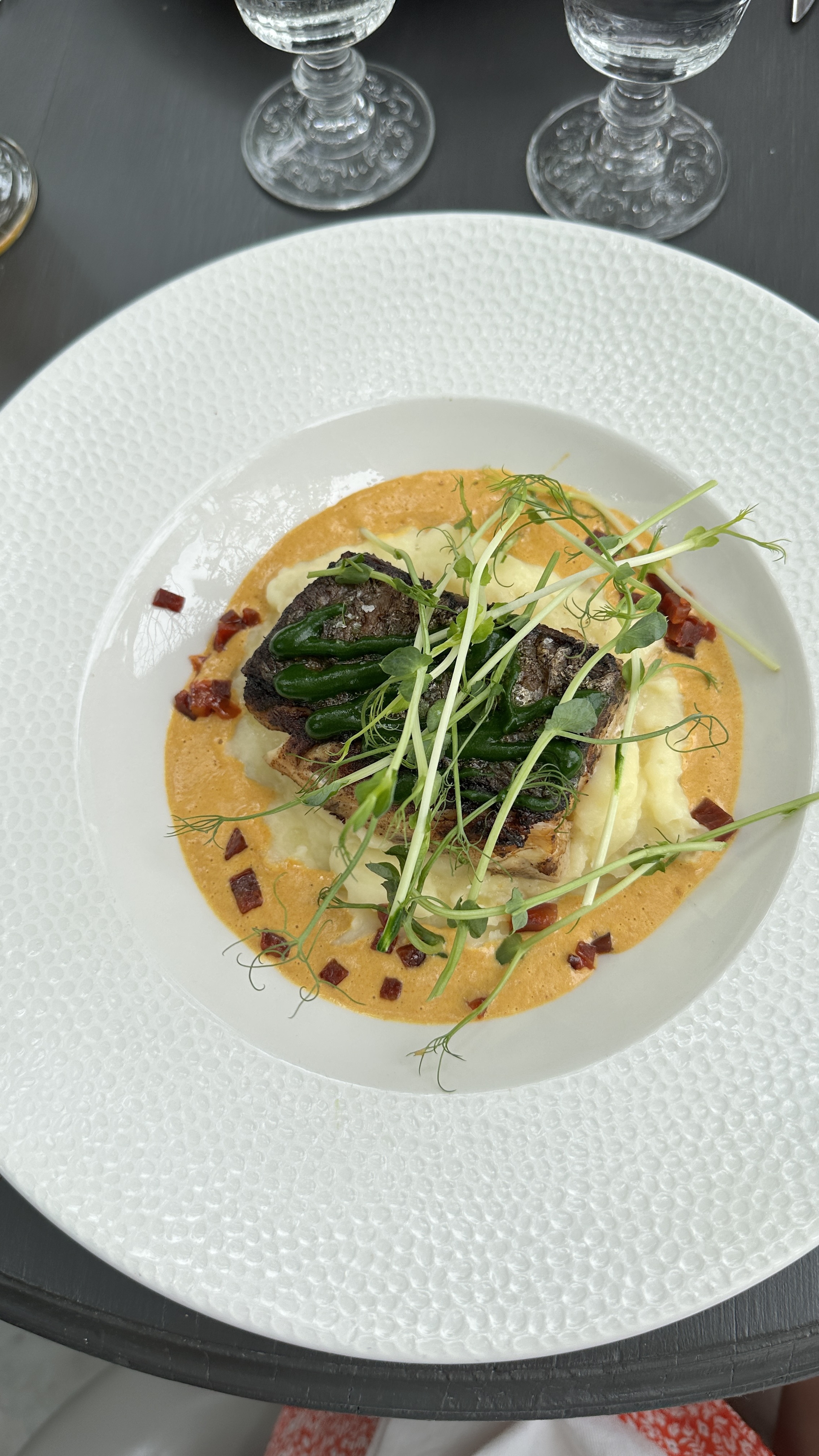 Très beau cadre mais la cuisine n est pas à la hauteur de l endroit. Des saint Jacques qui baigne dans une purée de betteraves, dommage pour les saint Jacques, qui du coup n'ont plus la saveur qu elles mériteraient Un onglet bon et bien cuit mais une purée avec une huile de sésame qui gâche tout, avec un léger goût de brûlé.
