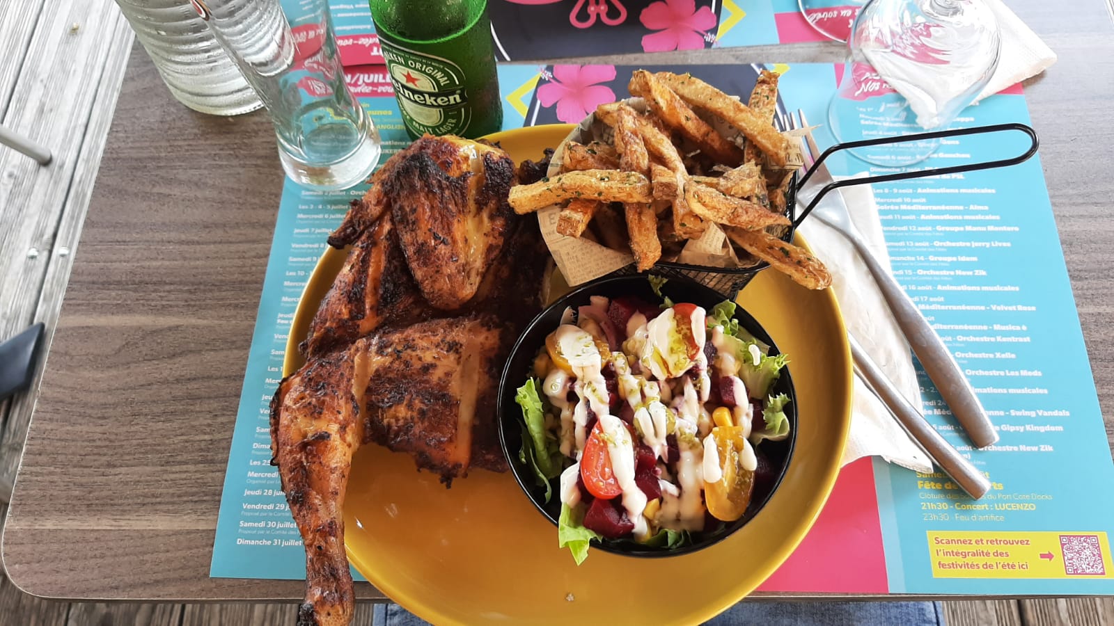 La spécialité du restaurant est un poulet mariné à la portugaise et c'est le meilleur poulet grillé que nous ayons jamais mangé, les frites sont faites maison et très bonnes, accompagnées d'un excellent rosé de Provence, et en plus de ça de bons et sympathiques conseils, que peux-tu demander encore ? Nous reviendrons certainement! Merci❣️🙋🏼♀️🦮🙋🏻♂️