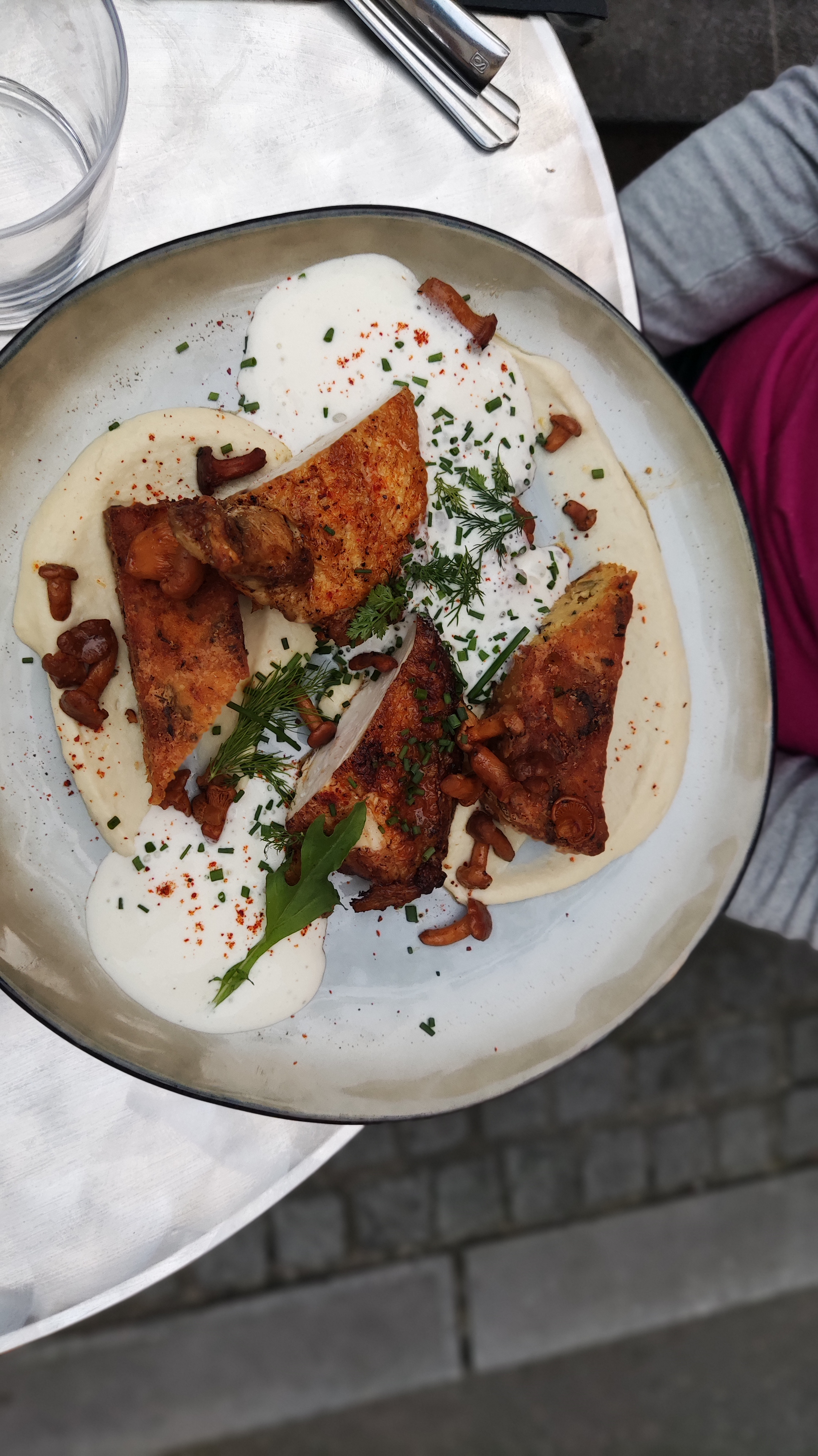 Service au top! Volaille avec une purée et une sauce magnifiques Sous un arbre fleuri ☺️