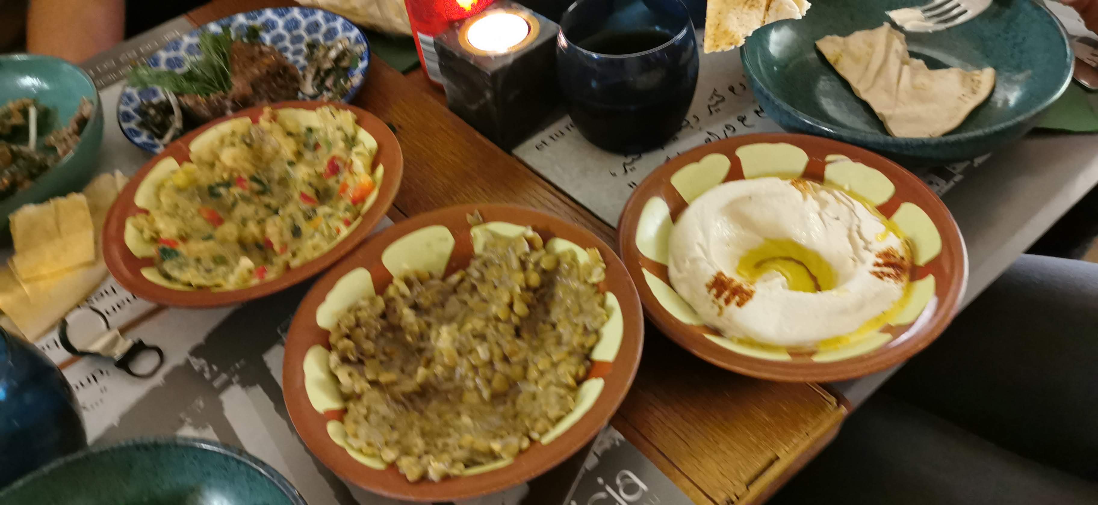 Nourriture absolument délicieuse! Nous sommes venus dans un groupe plus important de 8 personnes et avons reçu un certain nombre d'assiettes. Ils sont venus rapidement et avec des pains pita gratuits, nous avons donc tous pu goûter aux différentes tartinades et plats. Pour être honnête, je ne suis même pas sûr à 100 % de ce que nous avions -- juste que tout était vraiment bon. Je recommanderais de venir en groupe plus grand afin que vous puissiez obtenir les plateaux de dégustation - c'est une façon amusante et sociale de profiter d'un dîner entre amis. Le coût total s'élevait à environ 30 euros par personne, mais nous étions tous plutôt rassasiés à la fin !