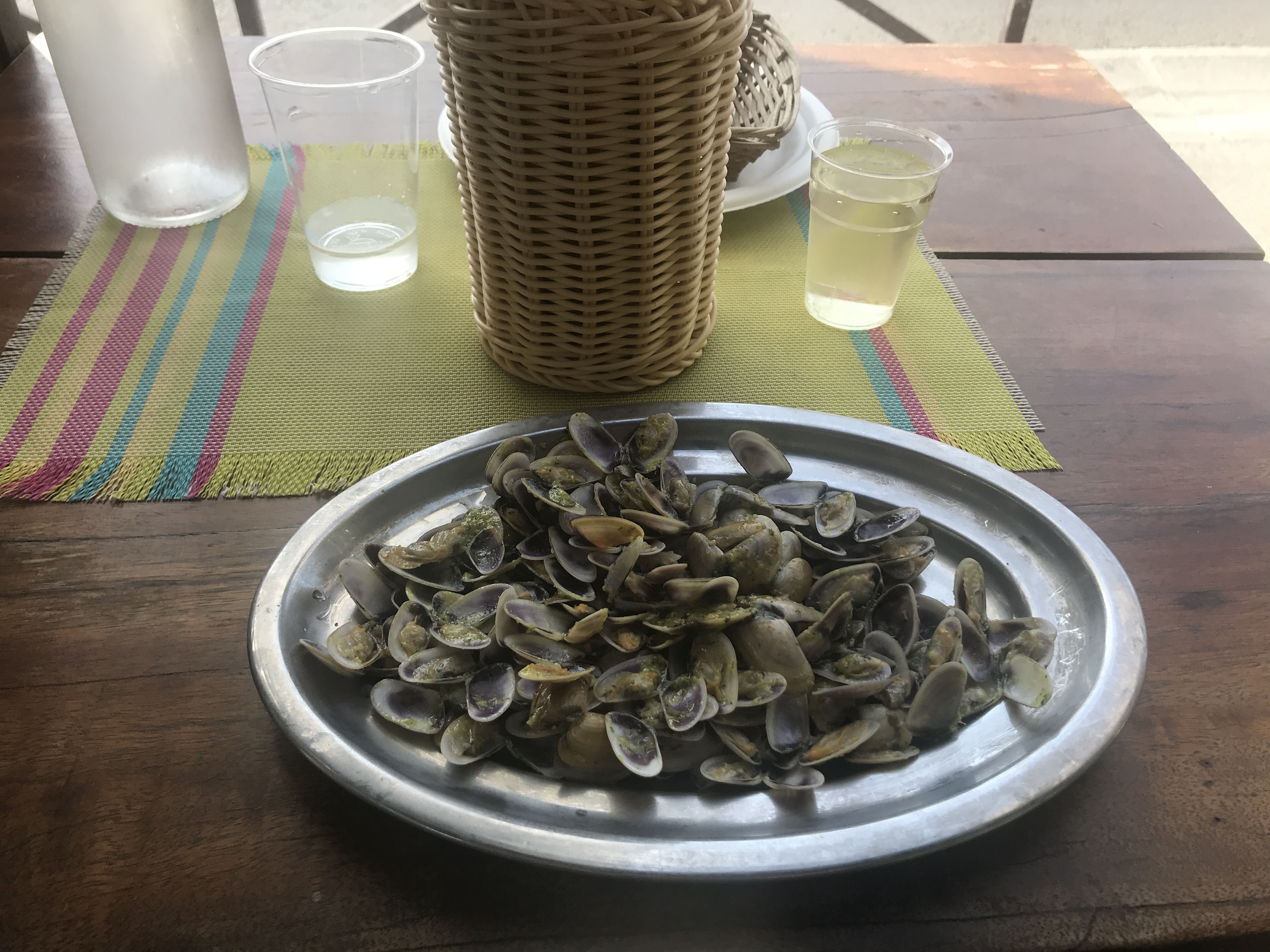 Couverts, verres et assiettes en plastique... sur le front de mer où il y a beaucoup de vent. C'est dommage d'imaginer combien de ce plastique se retrouve dans la mer. On nous a conseillé d'essayer les « couteaux » et les gambas. Gambas étaient annoncés à 12 pour 6 gambas sur le menu, nous n'en avions que 4 et avons payé 18. 50. ils ont facturé 5 e pour quelques pommes de terre bouillies et des tomates à part. Dans l’ensemble, cela ne vaut pas du tout son prix. Piège à touristes, je dirai que c'est tout.