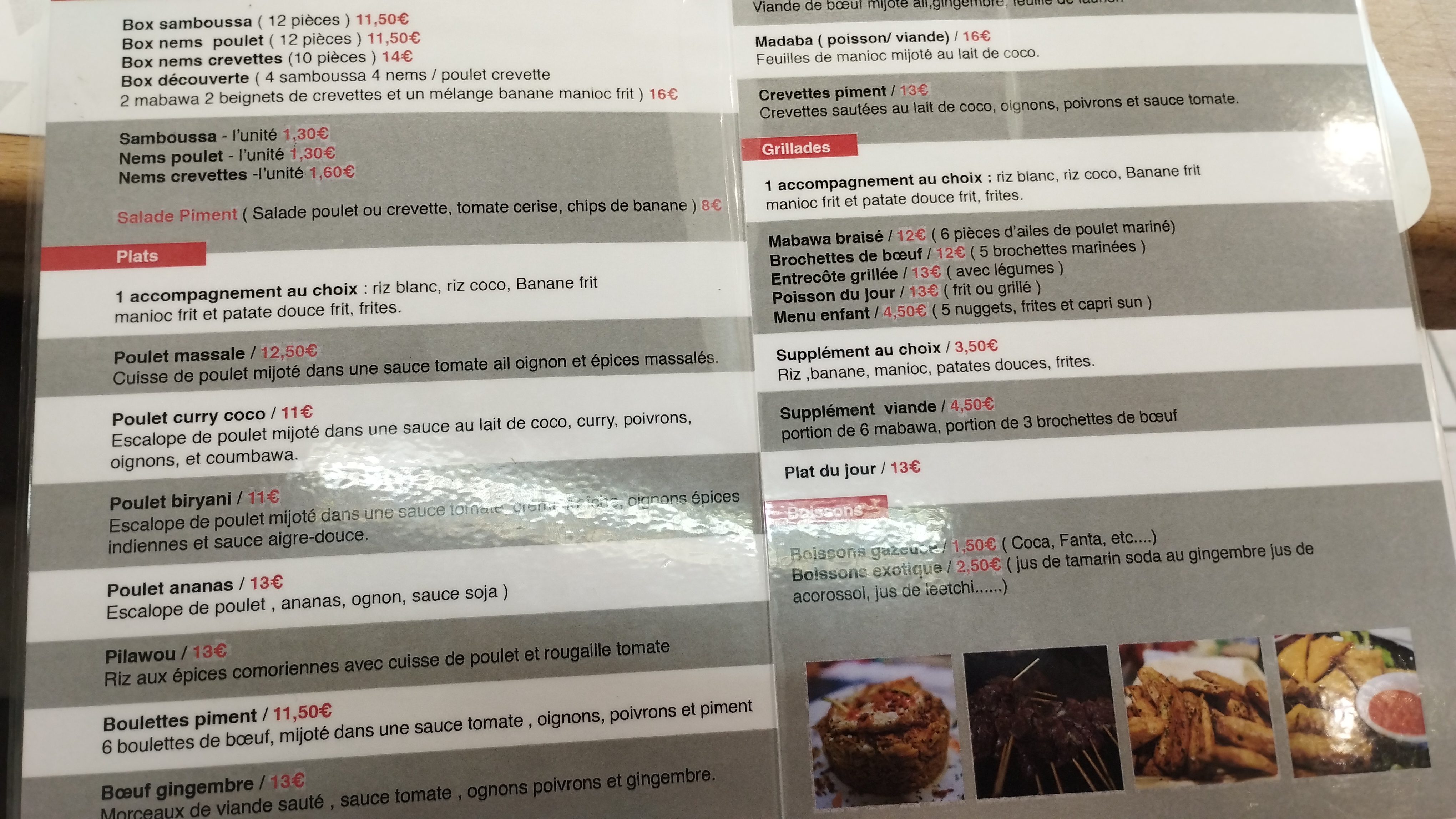 Experience unique, goût et variété divers, cuisine comorienne inégalé, un restaurant qui garde une authenticité par sa découverte des repas qui nous fais voyager au pays. Je recommande a 100% ce restaurant sans hésitation.