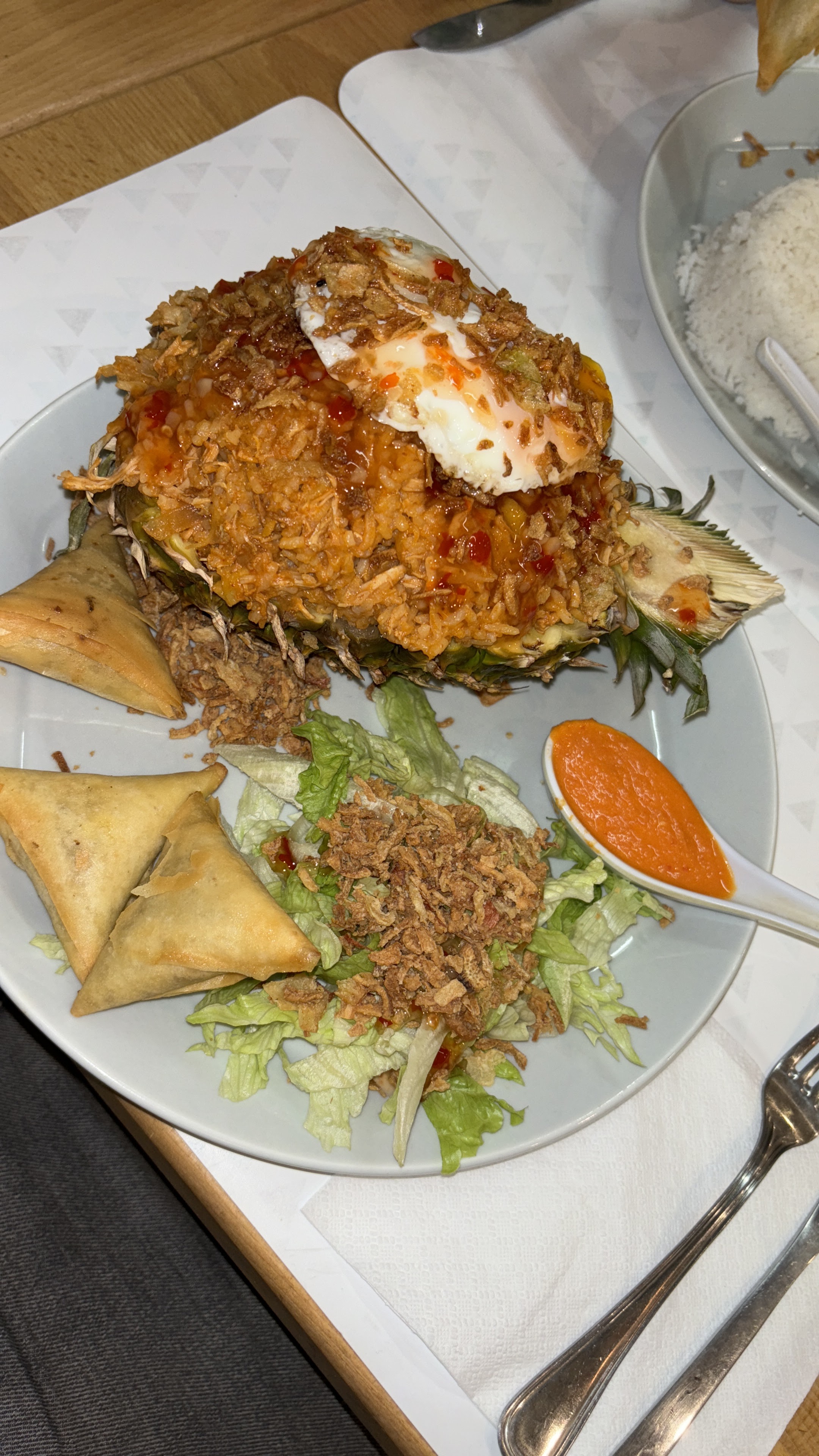 Repas très bons et très copieux. Ambiance amicale, lieu très propre déco rien à dire.Accueil chaleureux. Petit bémol salle non-climatisée. Pour les grands gourmands comme moi je vous conseille le plat Poulet Ananas c'est une tuerie