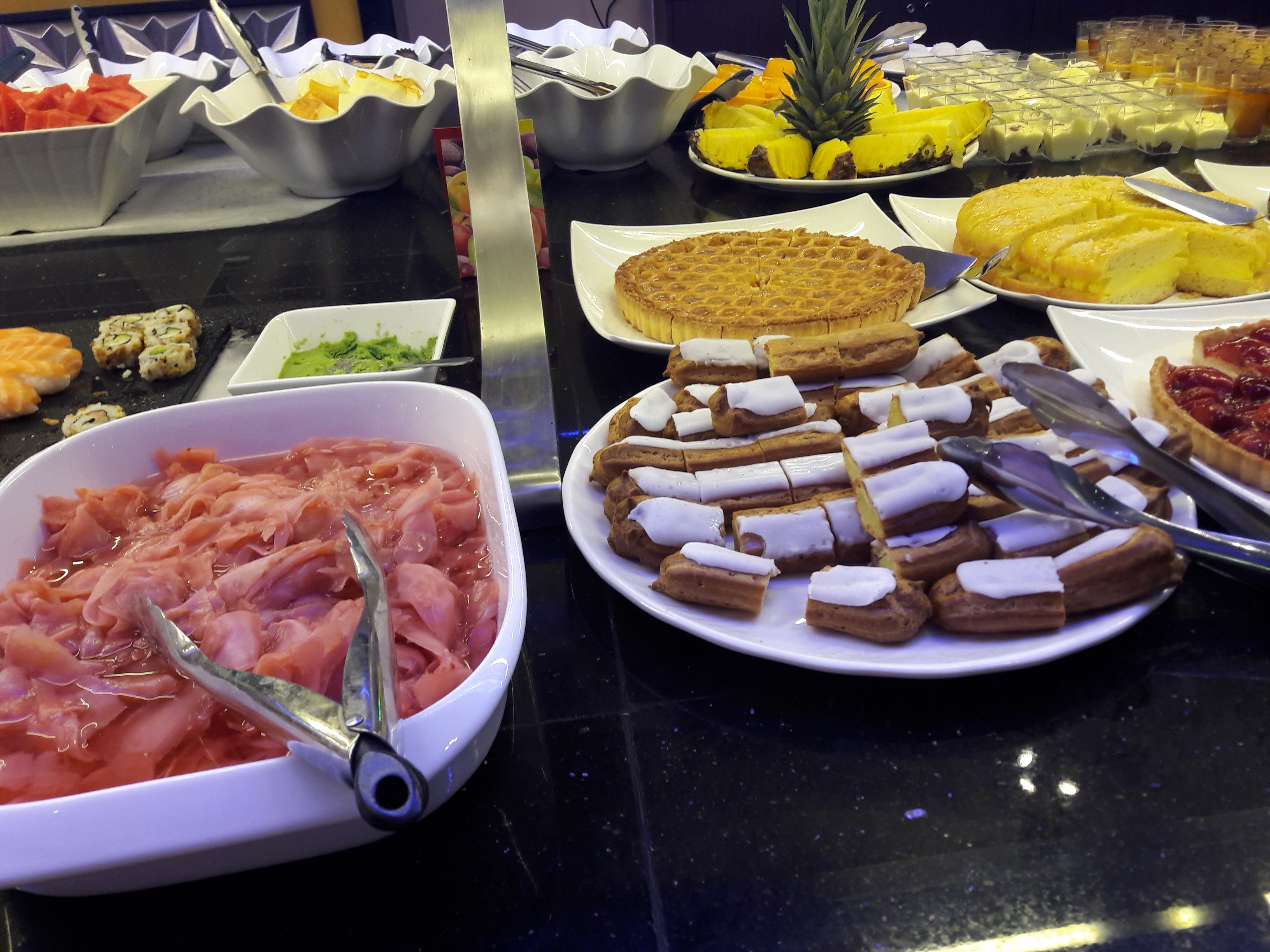 Buffet archi bien garni ! Mention spéciale à la dame qui prépare les sushis devant nous ! Étant enceinte et envie de sushis j’ai pu largement me faire plaisir car une large gamme de sushis était proposer dont plusieurs sans poisson cru !