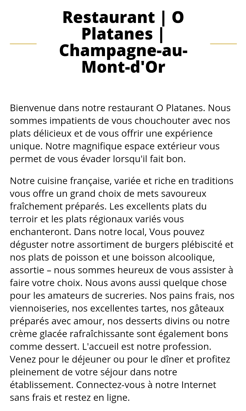 Quelle belle expérience, faute de trouver un resto dans Lyon nous sommes allés manger O Platanes. Tout était parfait, la réception, la service et le repas. Nous avons passé plus de 2 heures de plaisir dans une ambiance conviviale. Chose rare, on est venu à notre table à la fin pour voir si c'était bien passé. En plus, pas de problème pour trouver une place de parking. Merci encore à toute l'équipe.