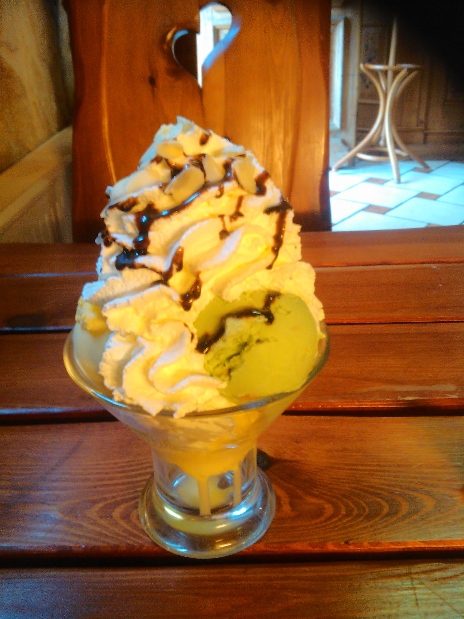 Beau décor Pas assez de quantité les portions sont un peu juste J'ai commandé une coupe 3 boules (pistaches et noix de coco avec crème fouettée) on me rajoute du colis au chocolat sans me demande mon avis je n'aime pas le chocolat.. Decu du début à la fin du repas