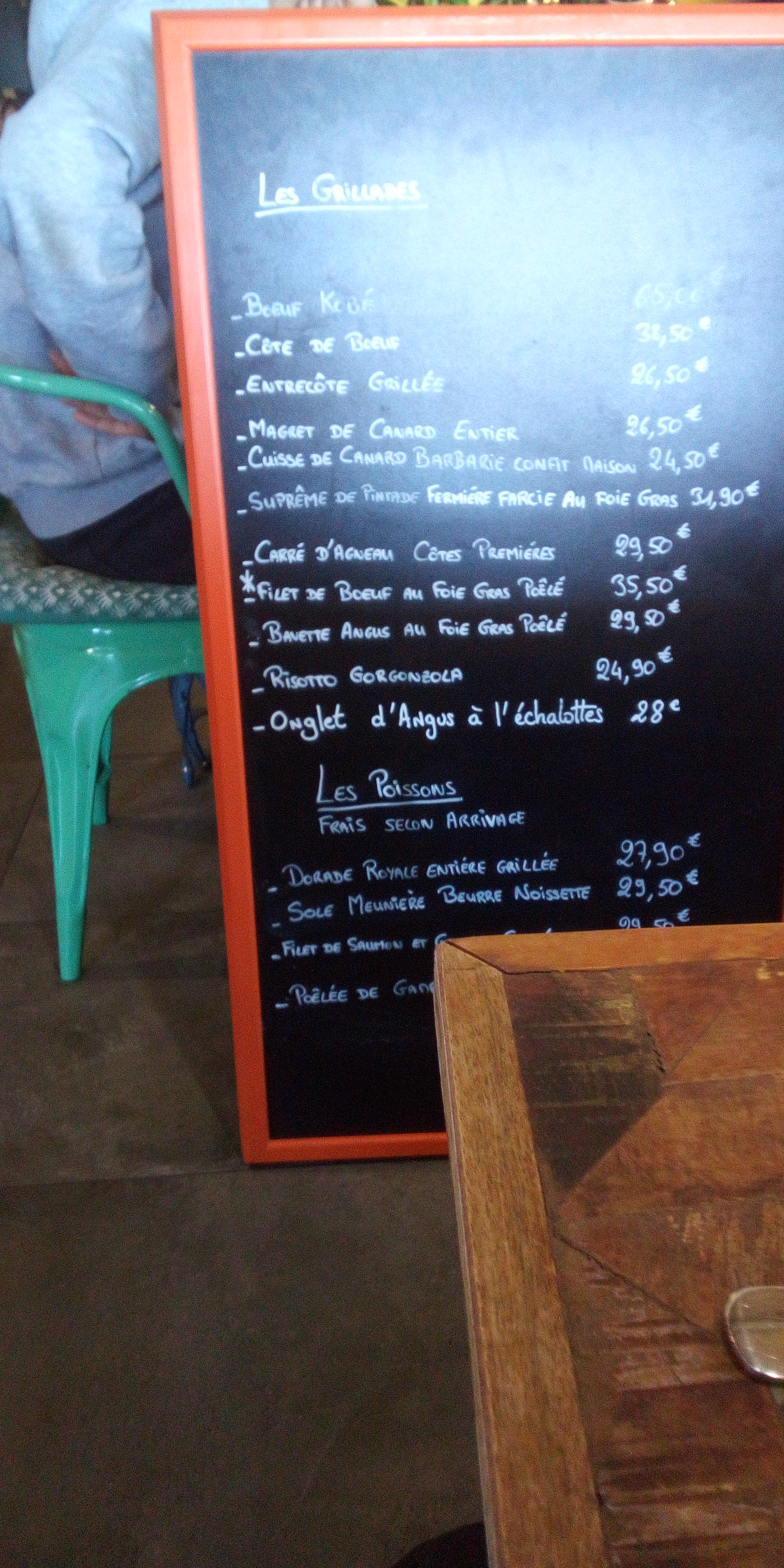 Très bon restaurant mais les prix sont élevés (entre 20 et 30€ environ). 35 cts la barquette si vous n'avez pas réussi à finir votre plat, car ils sont copieux. Petite entrée de velouté de légumes offerte, excellente!! Si vous commandez un steak, le serveur vous le chauffe avec un fer à repasser en fonte, super original.