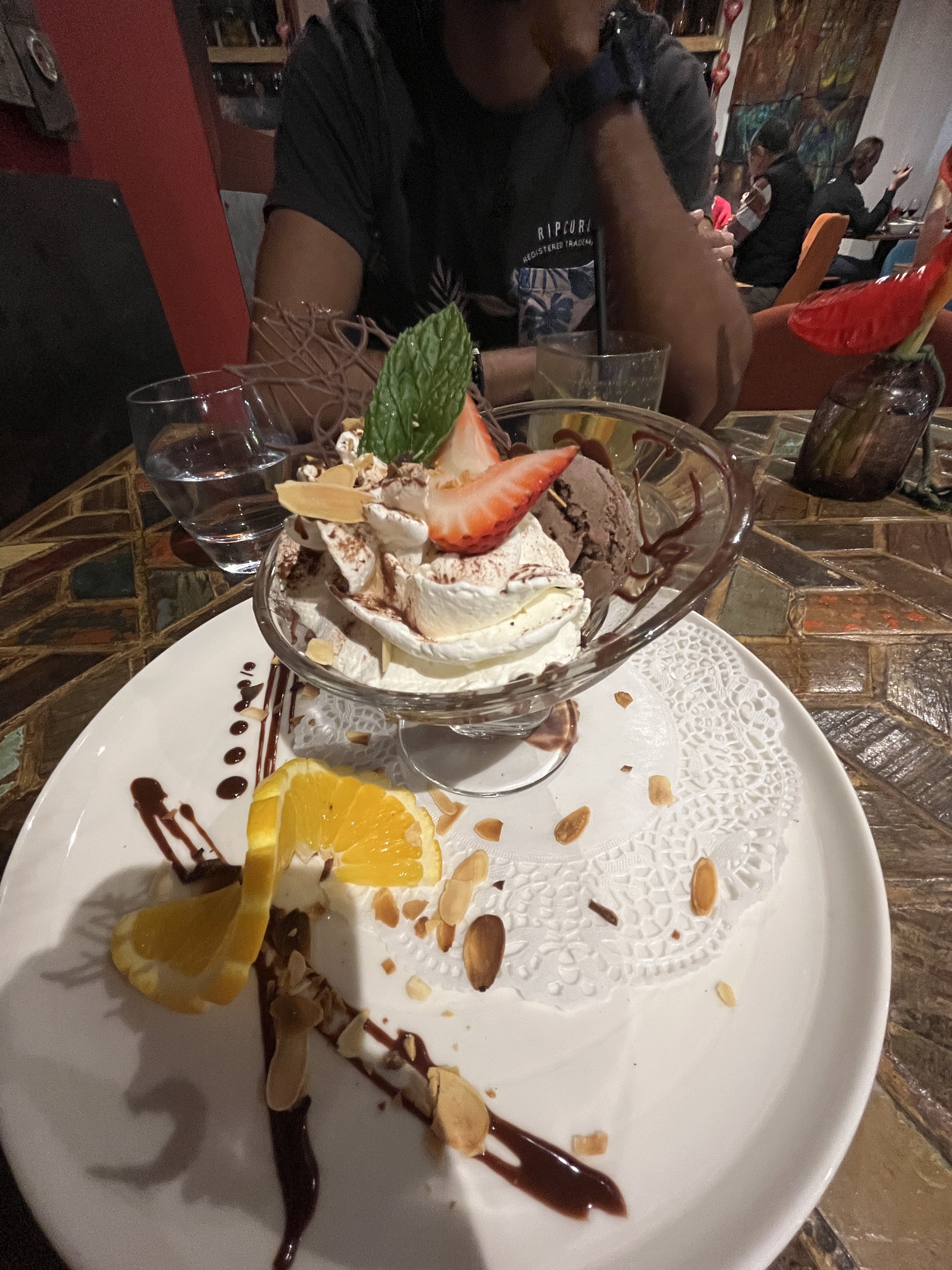 Oui, c'est certainement plus cher que les autres restaurants que nous avons visités, MAIS ils ont beaucoup de choix : créool, africain, végétarien, poisson et grillades. Le personnel est super, amusant, très bien situé (venant d'une des promenades) et un décor magnifique. Nous avons opté pour une salade de fromage de chèvre à partager, puis une dorade grillée avec des légumes en accompagnement et un cordon bleu accompagné de pommes de terre au four. Bonne nourriture. Beaucoup. Cuit au four et grillé à la perfection. Nous avons payé 96 euros et n'avons pas pu inclure de pourboire sur notre carte, ce qui était dommage. Mais nous reviendrons.