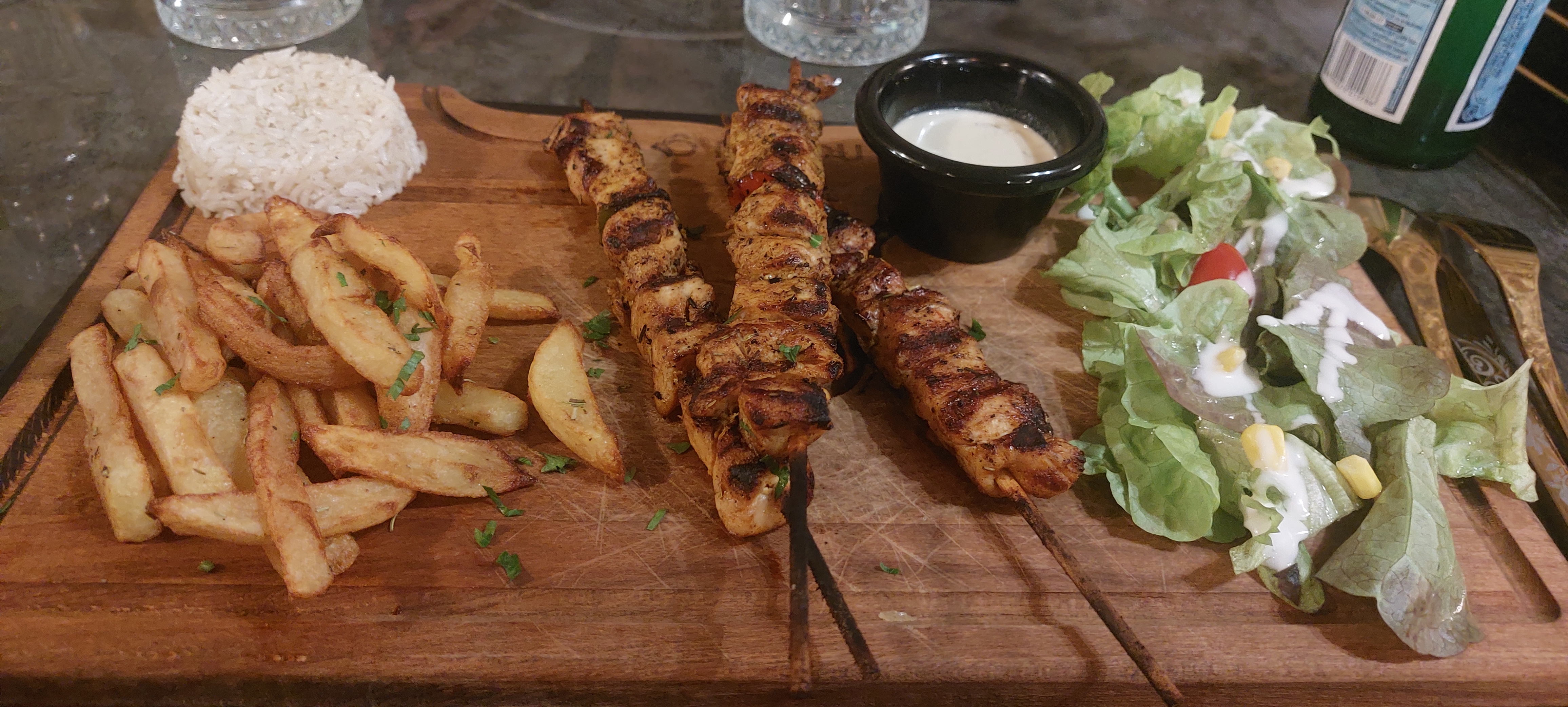 Stationnement facile et bon accueil, Surprise de trouver un tel endroit ici,deco et ambiance sympa. Service au top ,personnel accueillant et attentif à nos besoins,et prix compétitifs Les entrées et les plats sont bons bien présentés et bien préparer. Le seul bémol était sur la semoule du couscous.