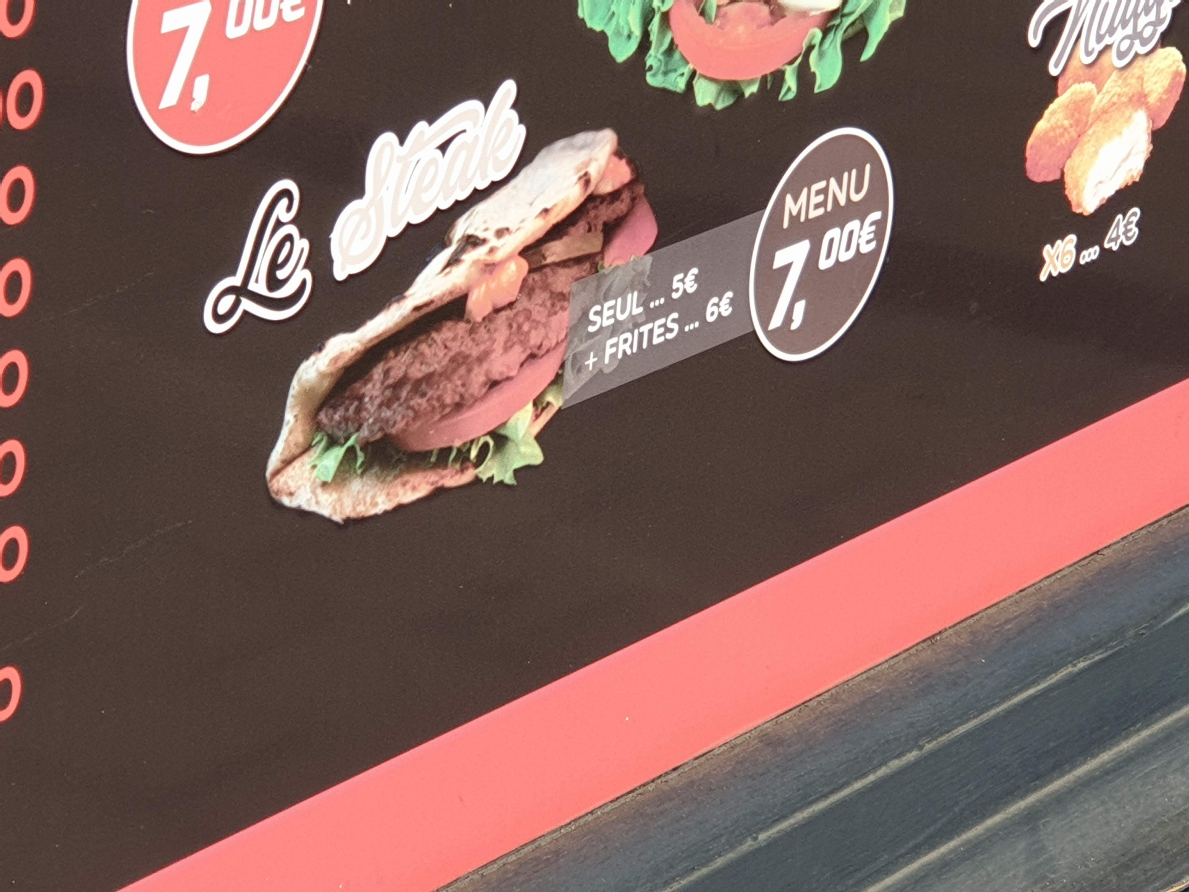 7 euros pour un mini Steak, c'est vraiment abusé, sur la photo réel publicitaire, et leur Steak dn ma main on voit une grande différence , même avec un McDo tu sors tu as plus faim , je le déconseille pour toute personne qui veut manger, toute personne qui veut manger chez lui regarde bien la photo du steak dans ma main
