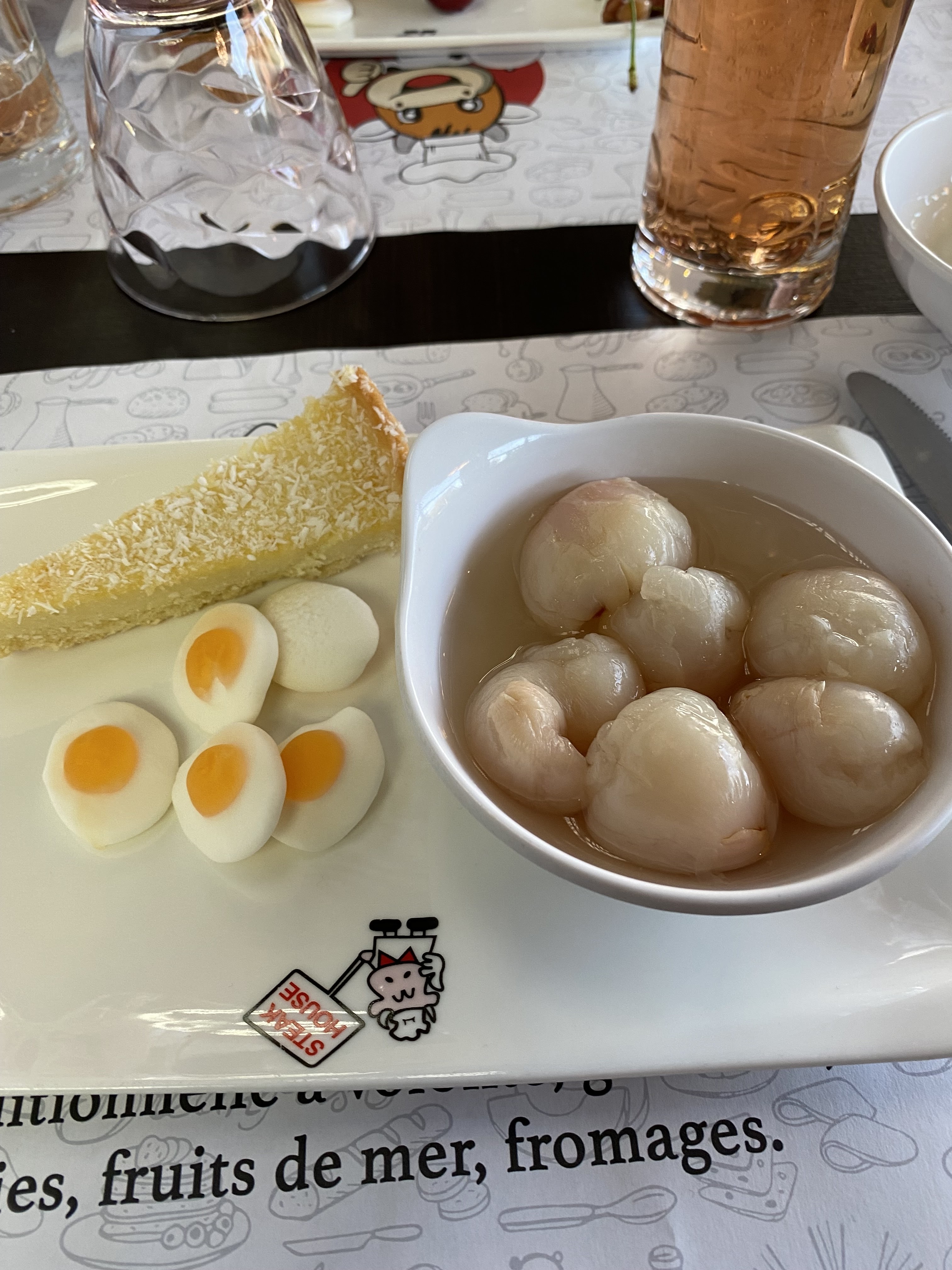 Beaucoup de choix. Pas mauvais. Petit bémol sur la part de flan sans tenue et sans goût. Le reste est tres correct. Personnel au petit soin.