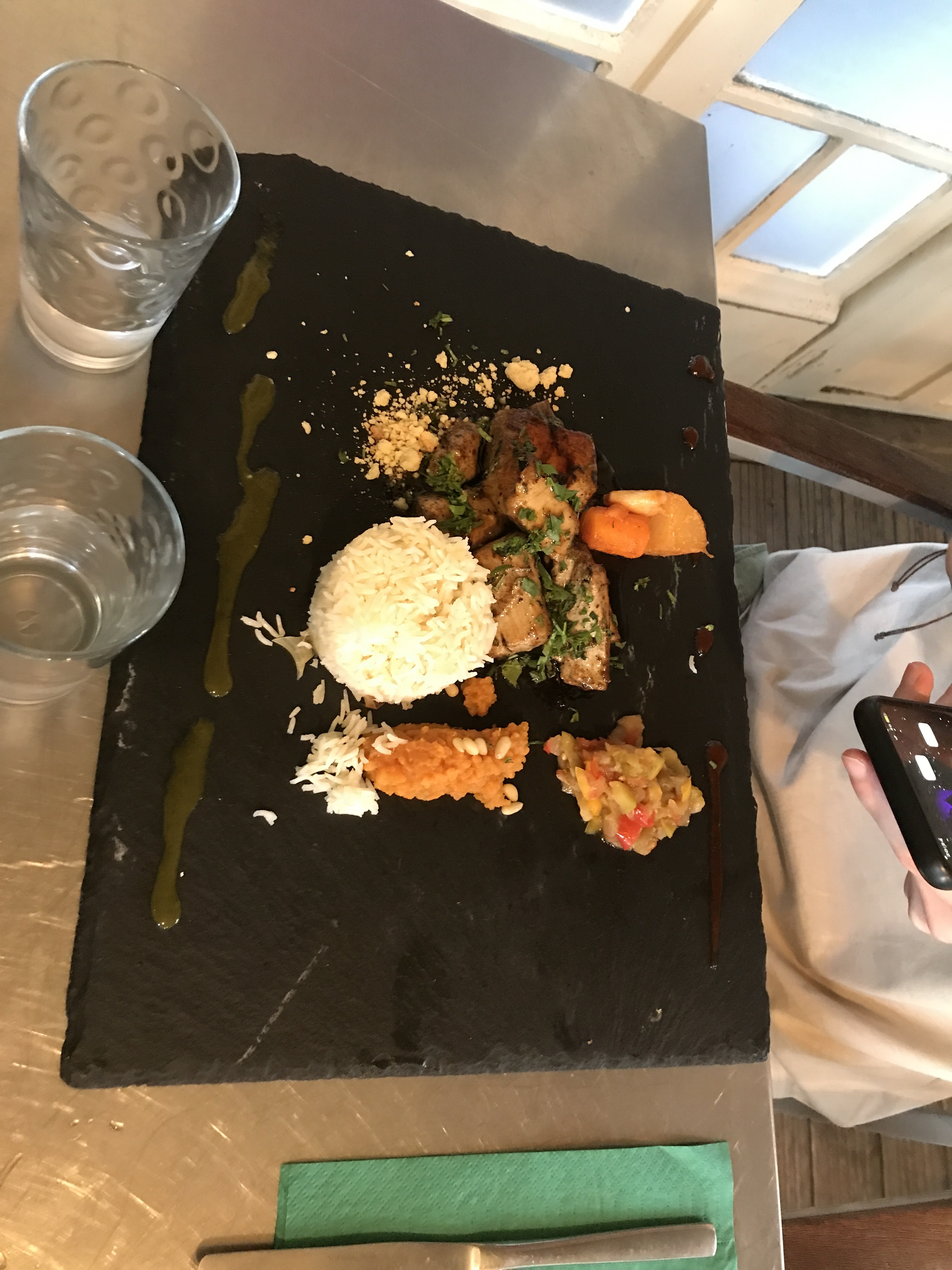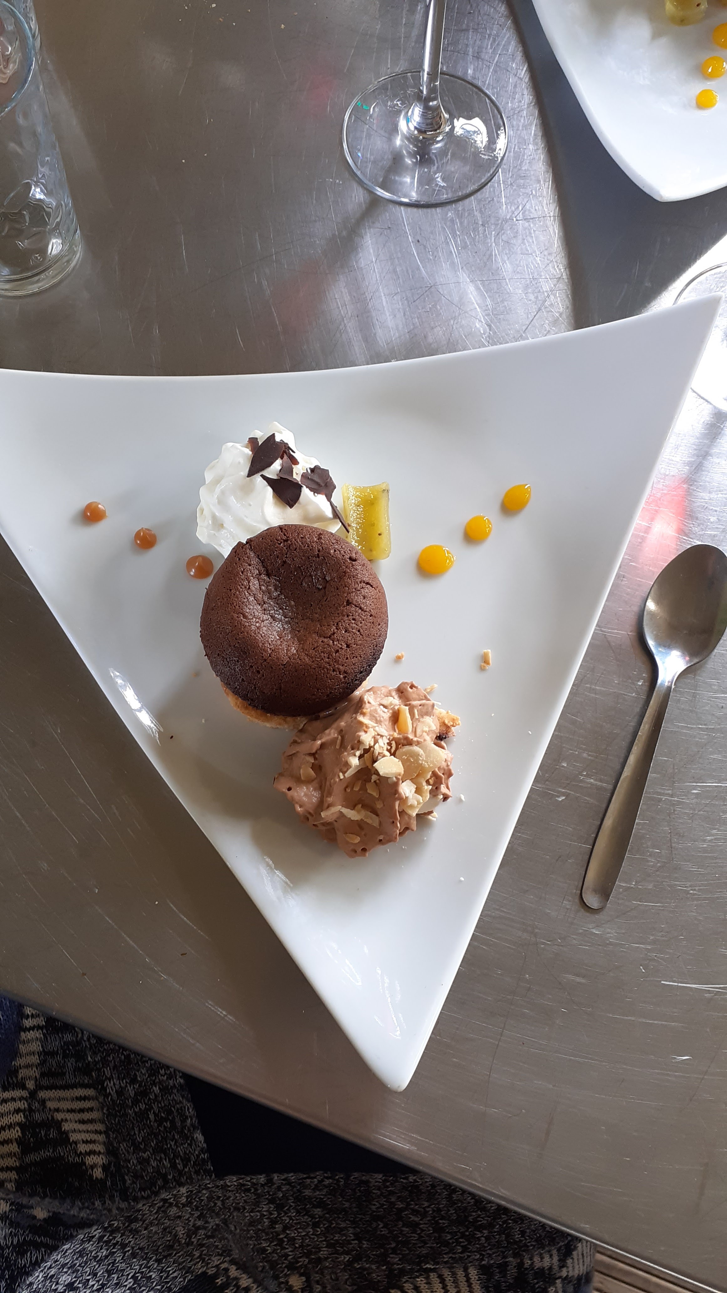 Nous avons découvert un restaurant à la cuisine raffinée, dans un lieu très atypique, fait de bric et de broc, au sens charmant du terme. La cuisine est ouverte, en hauteur, et permet de voir les chefs à l’œuvre. Nous avons opté pour un crumble de saumon, dont la cuisson était parfaite et la garniture très à propos. Petit bémol, le pain - maison - était tranché très très menu et délivré en très très petite quantité, donnant l’impression d’être rationné. Pour le dessert, nous avons opté pour un tiramisu revisité et un fondant au chocolat. Le premier manquait à notre goût de texture (beaucoup de crème et de chantilly pour peu de biscuit), le second était quant à lui un brin trop cuit (une crème l’aurait agréablement accompagné). Le plat principal, très raffiné dans sa présentation et sa composition, reste la belle découverte de ce repas. C’est une adresse que nous retiendrons.