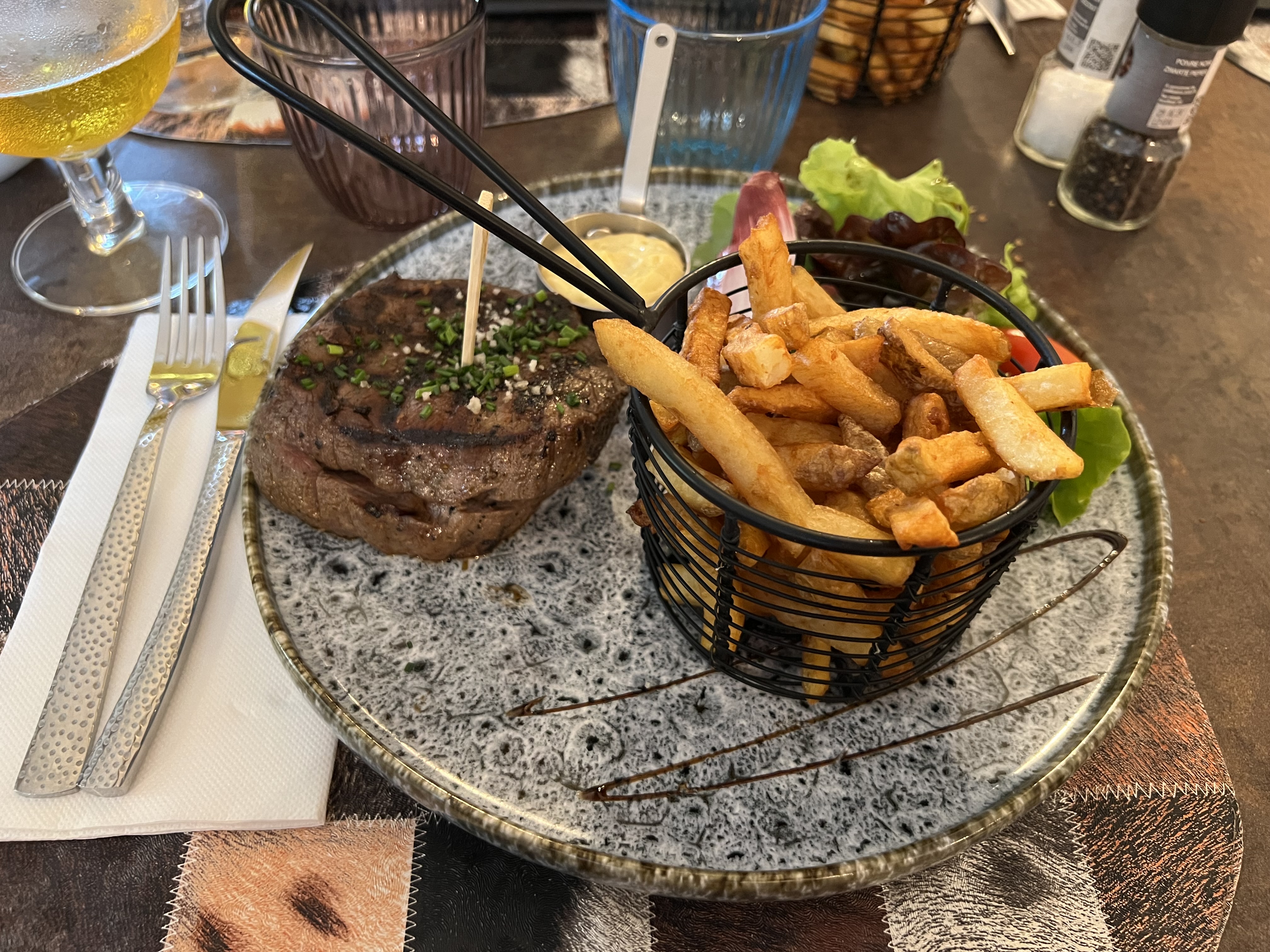 Entrecôte cuite avec maitrise, frites croustillantes à souhait. Service parfait du début à la fin, mention spéciale à la mayonnaise truffée. Je reviendrai volontiers ! Bonne continuation, merci, et à très vite !