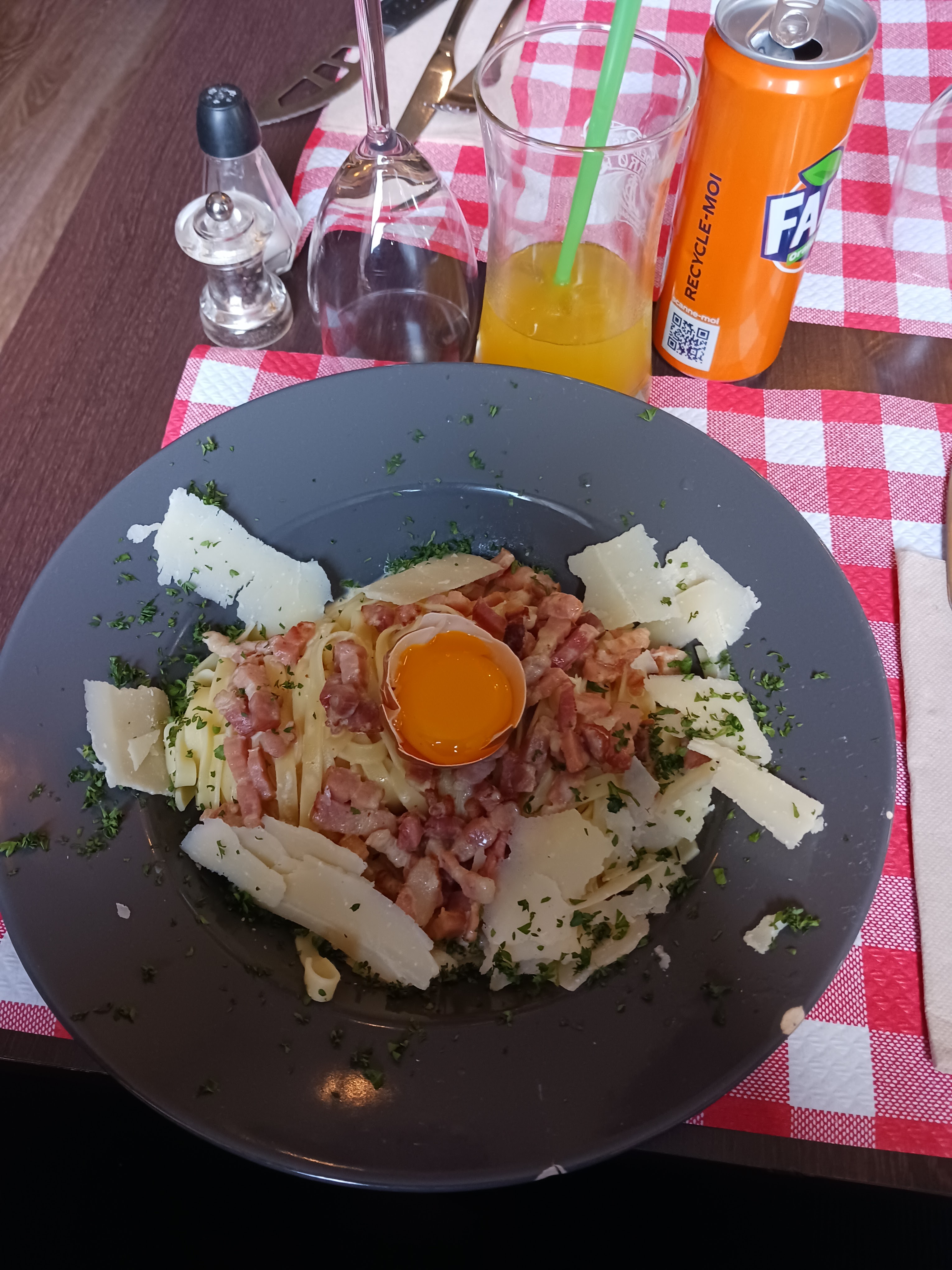 super accueil , nous avons mangé les pâtes carbonnara et nous nous sommes régalé , egalement un format adapté pour un enfant et surtout l'acceuil et le service que nous à résérvé la patronne ( je crois ) etait super agréable.