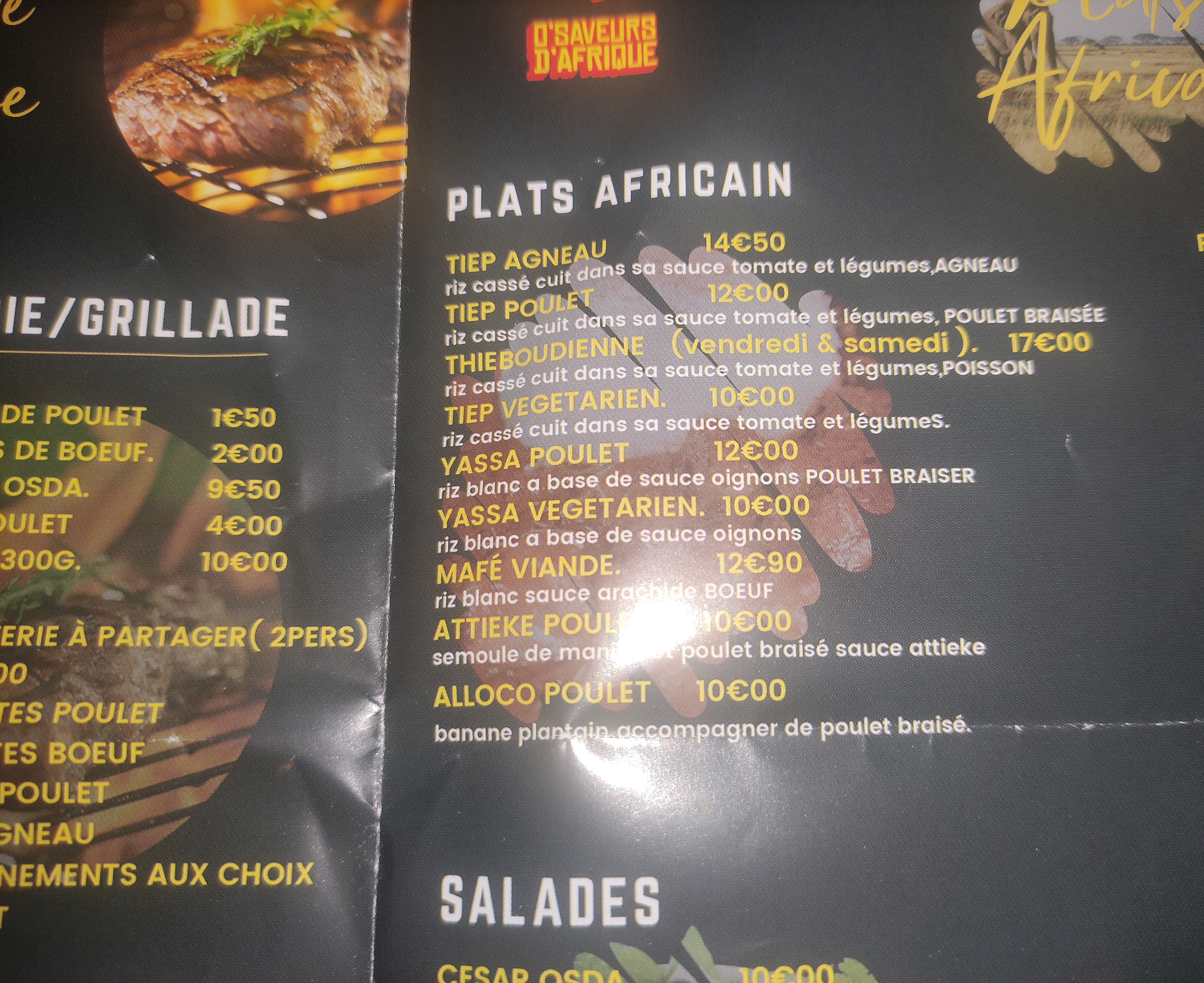 Je vous recommande vivement O’saveurs d’Afrique vraiment rien a signaler j’ai mangé du dibis et j’ai adoré le bisap aussi c’était top