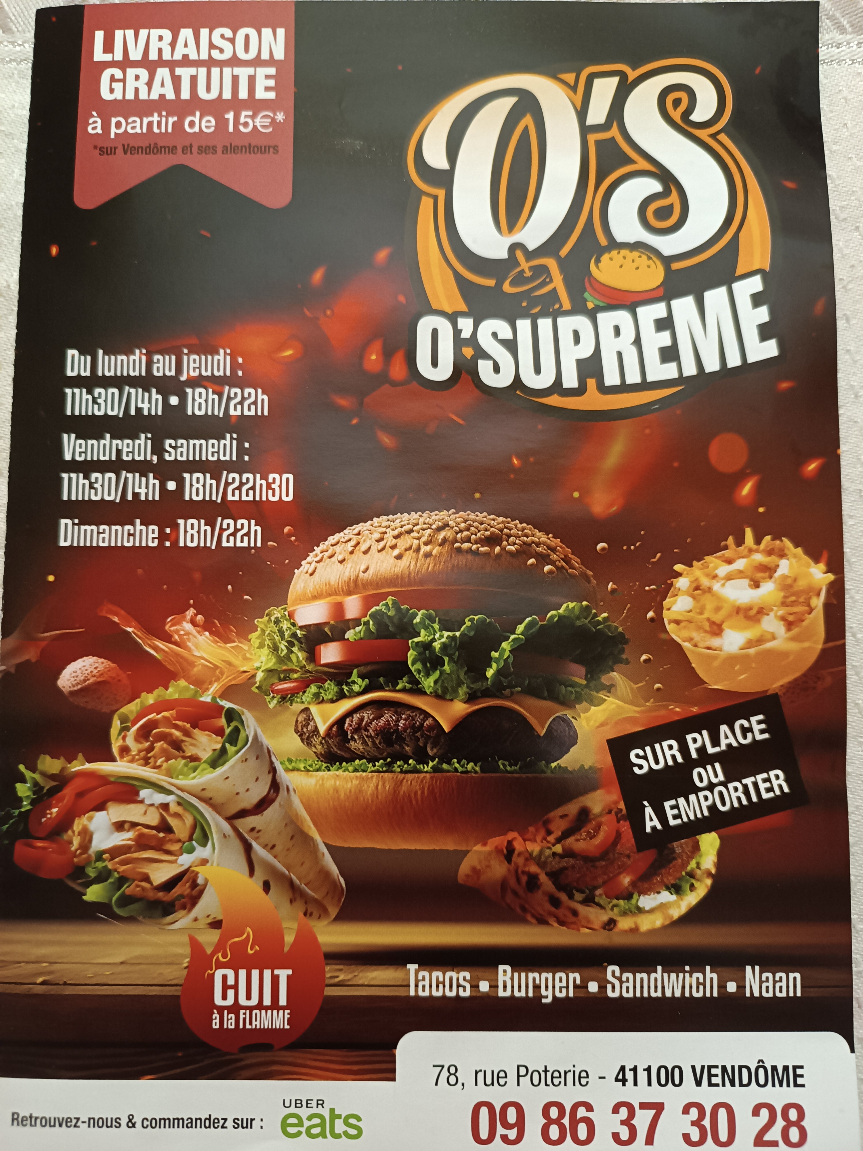 Que dire! Mais que dire!!!! Une superbe découverte.... La salle permet de recevoir les clients. Des tables sont mises à disposition pour manger sur place. La carte est claire. Pas de mauvaise surprise. Nous sommes accueillis extrêmement bien par les gérants et les employés! Vraiment agréable. Les locaux sont vraiment propres. Comme mis dans d'autres avis avant le mien: on sent la générosité des gérants dans leurs plats et c'est vrai! Je me rappelle au tout début du projet de l'aventure, le gérant me dire: quand on ouvrira et que les clients auront terminé de manger, ils n'auront plus faim et bien je confirme: J'ai été rassasié! Les portions sont justes ultra généreuses (sur la photo mon Kebab était sans oignon et sans tomates.... Imaginez la quantité de viande....)! Et la viande KEBAB est juste topissime!!! (J'aime énormément le concept de servir les frites à part du Kébab (à emporter) car sur Vendôme beaucoup trichent en mettant les frites avec le pain, la viande.... Vraiment merci! Une superbe expérience que je renouvellerai sans hésiter! Sur Vendôme j'avais mis dans mes avis que le Kebab de la Tour'Ka était le meilleur, mais pour ma part, le Kebab de O' Supreme est juste le top!
