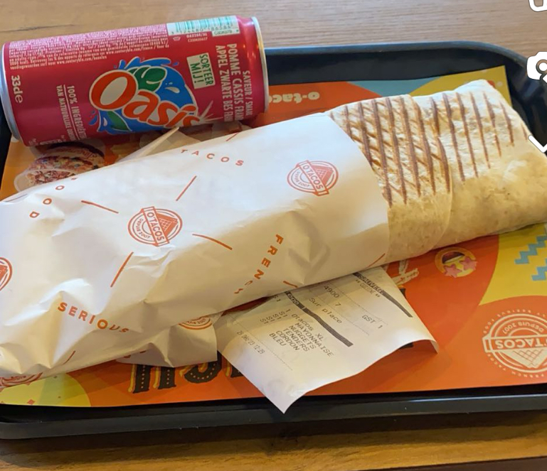 J’ai commandé un tacos 3 viandes avec supplément poivrons et champignons, les suppléments étaient bien là et en bonne quantité mais malheureusement la viande n’a vraiment aucun goût, la sauce fromagère a un goût assez spécial et le tacos était relativement humide au toucher. Pas mauvais, mais pas excellent non plus.