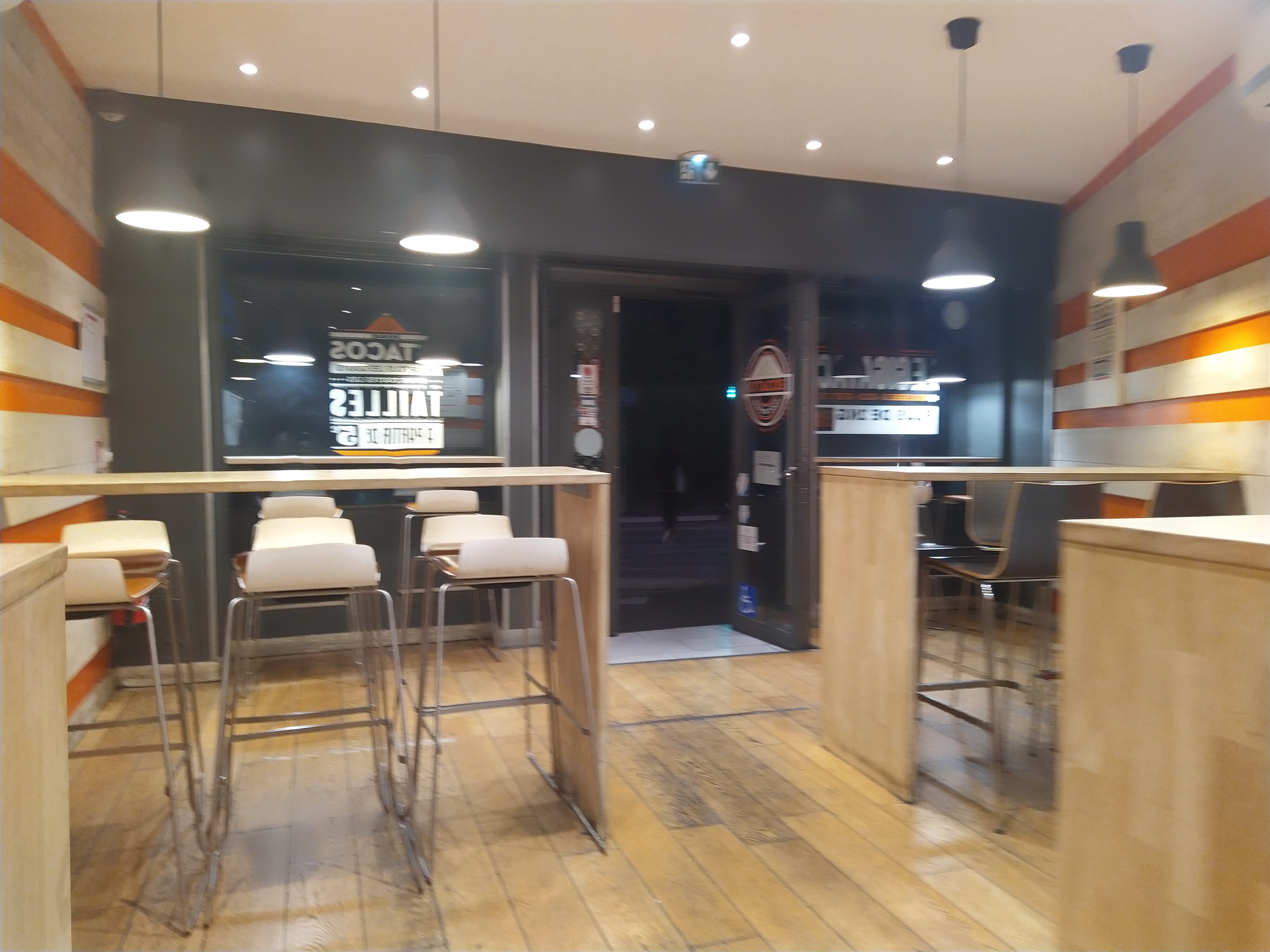En soirée vers 23h c'est super long zéro propreté il ya que 1 personne qui fait la caisse et prépare le tacos donc c'est pas évident de toucher le clavier pour le menus ensuite il va derrière pour préparé le tacos avec ses mains pas laver a chaque fois il doit faire des aller retour pas évident question d'hygiène