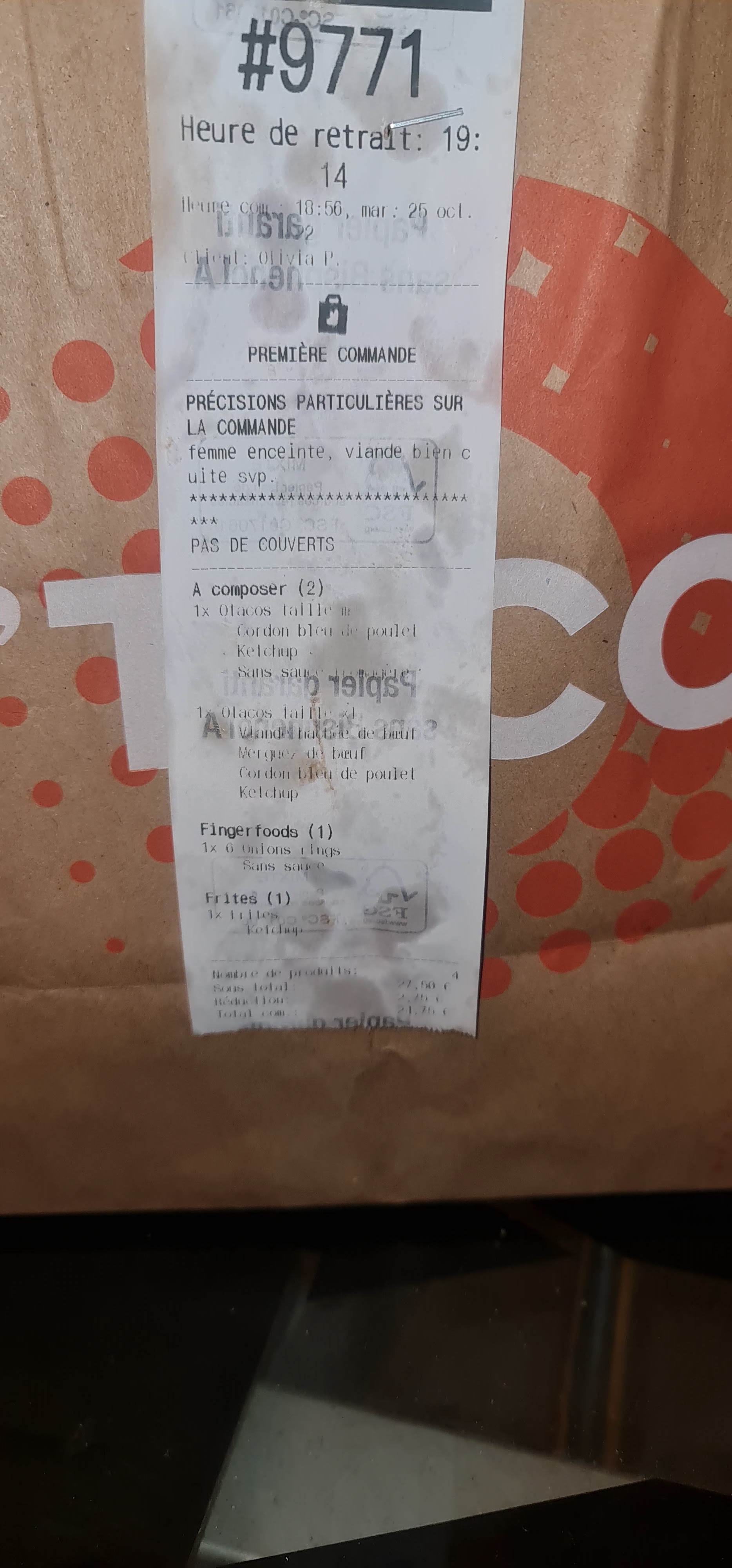 Alors j’adore énormément O’Tacos, et je met jamais d’avis mais alors la, ça commence à être très chiant de voir des frites dans son tacos alors que j’ai choisis l’option sans frites donc ça fait 2 fois ça commence à faire. Soit lisez bien ou alors apprenez à lire les commandes merci.
