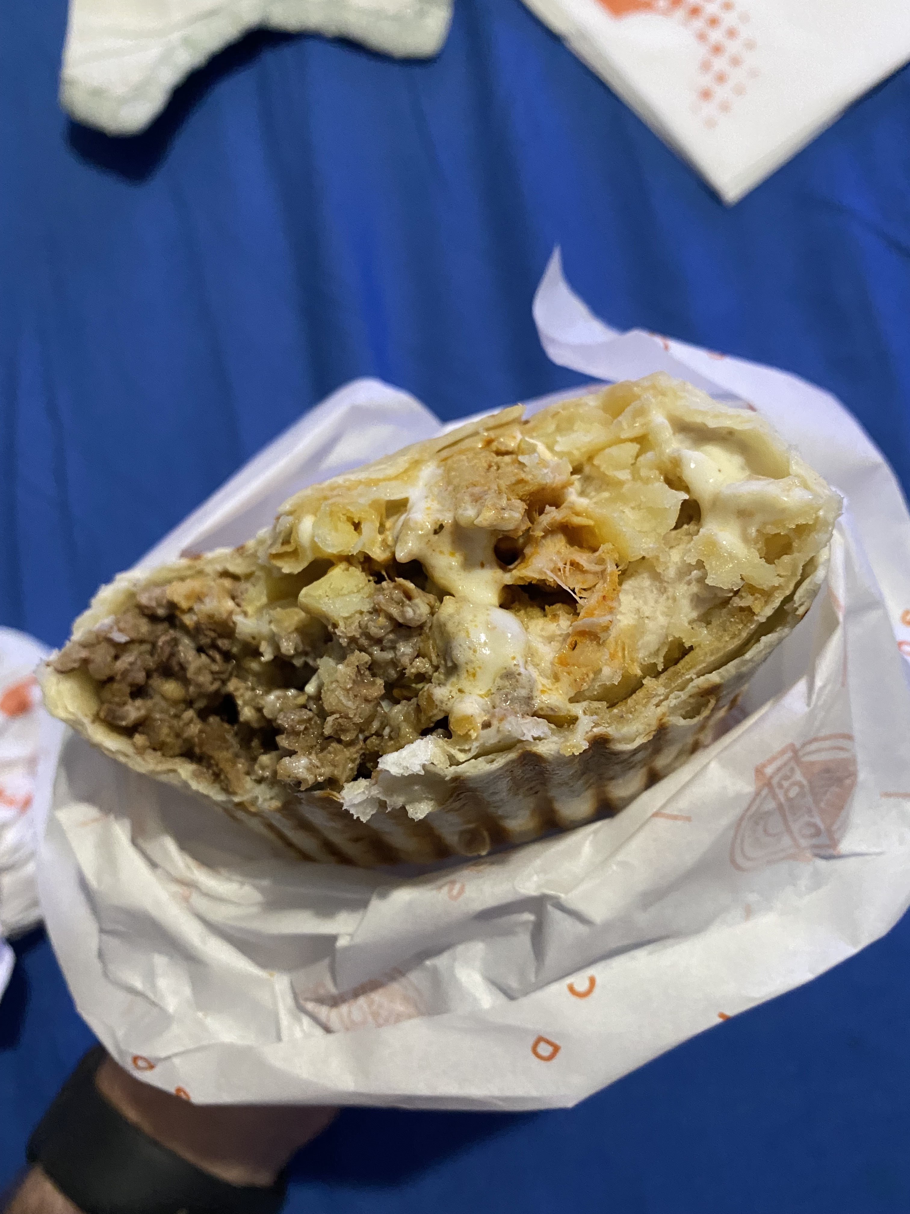 On va pas se mentir c'est clairement dégueulasse, votre taco est fourré de frite bien lourde baignant dans une sauce fromagère. La viande se battant pour le peu de place qu'il reste. Bref pour le prix allez dans des petits restos libanais ou asiatiques, vous mangerez beaucoup mieux