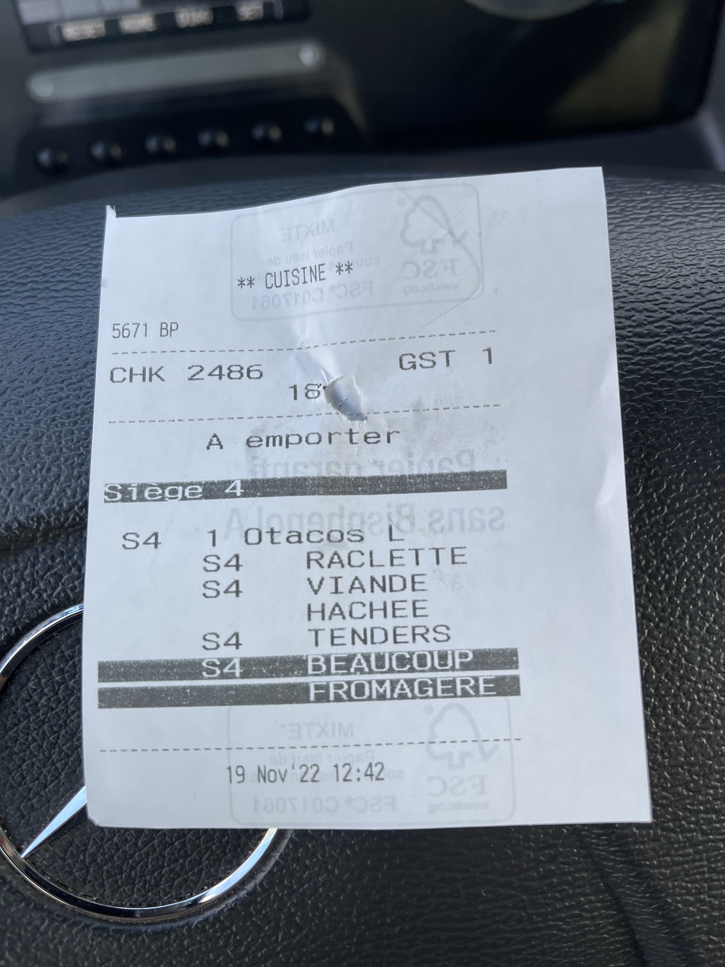 Très déçu. Tacos très sec. Pas assez de sauce fromagère dans le tacos.