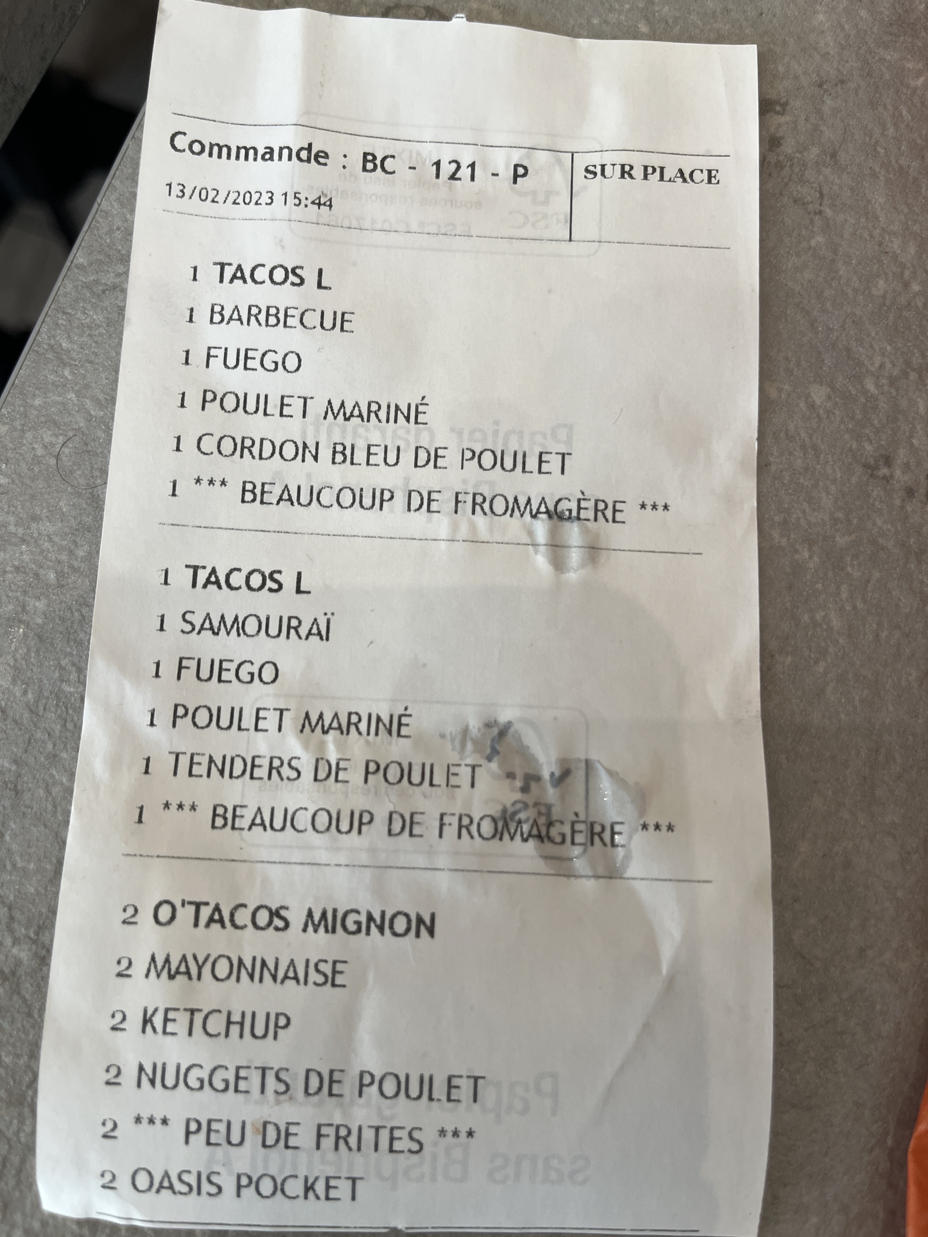 Commande tacos sans frites, une fois chez moi y'a des frites, dommage