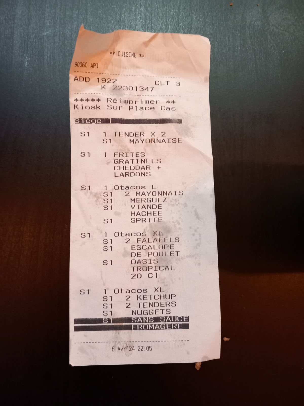 Servit rapidement, j'ai pris a emporté et la borne il faut se souvenir de son numéro, moi qui pensais avoir un ticket j'avais l'air bien con 😂 Il me manquait juste mes sauces j'étais déçu juste de ça mais bon 👌🏻😅