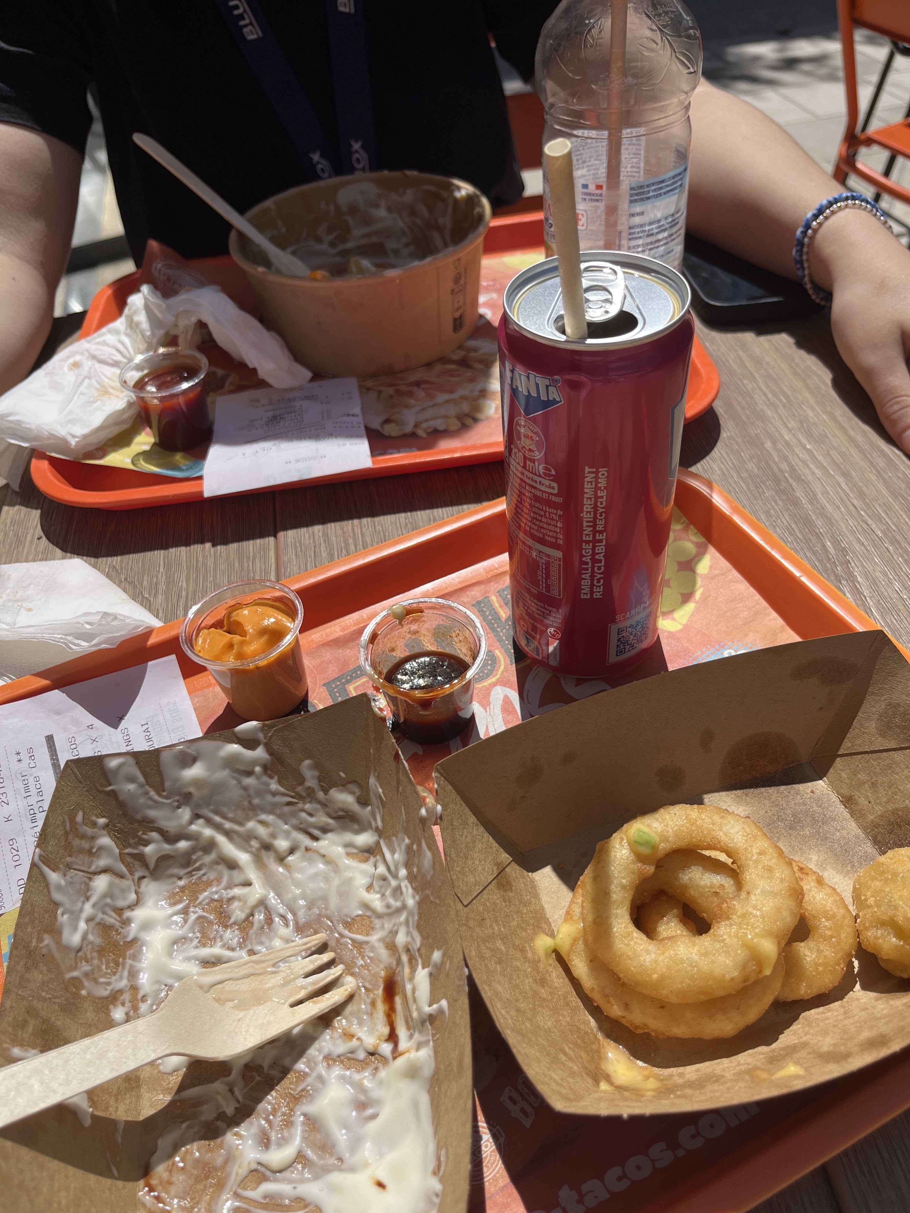 Tables extérieur très sales obligé de changer !! On a l'impression d'être servi pas des enfants !! Oubli un tacos,oubli une sauce et oubli les canettes !!! Et pour le tacos en lui même vraiment pas bon !! Je ne reviendrai pas !!