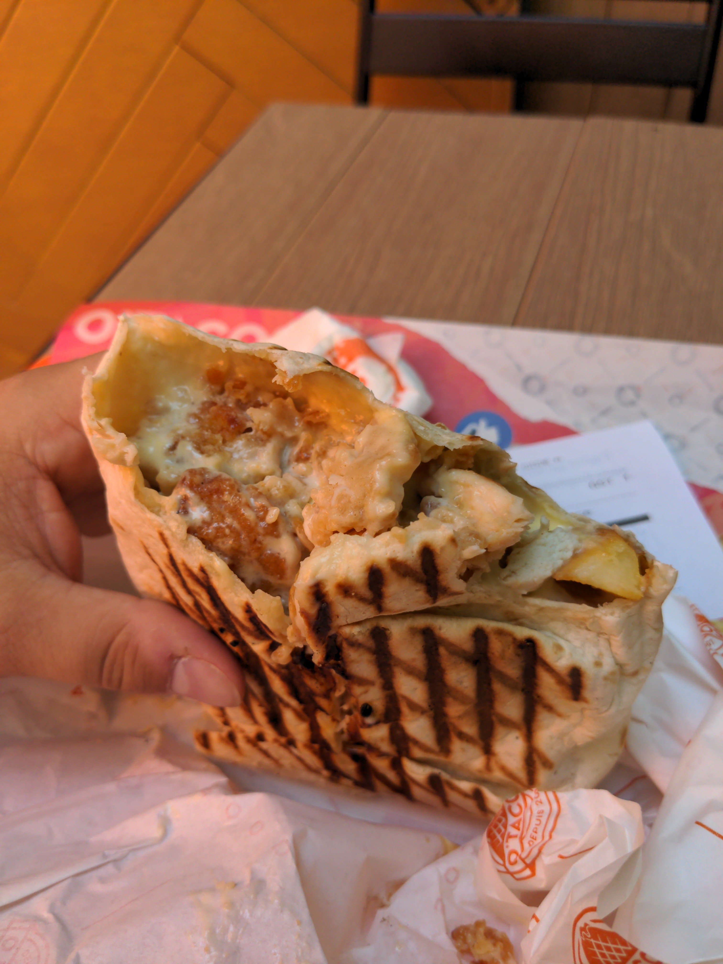 j'ai commandé 2 tacos livraison domicile pour 2 personnes. Cela faisait longtemps que je ne suis pas venu. Donc comme c'est livraison à domicile, je n'ai pas été confronté à l'acceuil donc je ne peux pas juger dessus. Mais sérieusement, j'en ai connu des chaine de fast food. Je suis un gros mangeur. Mais O Tacos ! Et ce n'est pas la faute des employés, ils font avec les ingrédients que propose la marque. Mais sérieusement comment il peut avoir de la demande sur un truc pareil !! je ne comprends pas...vraiment ! Et je suis pas difficile pourtant. On avait pris poulet curry. Le poulet était sec mais sec au possible !! Les frites..Quelle horreur les frites !! Molles ...la sauce curry une sauce industrielle bonne (mais bon de la sauce quoi...et heureusement qu'elle est là pour cacher le goût du poulet archi sec !..). Non mais sérieusement comment on peut apprécier ça quoi !! Donner du crédit à un truc pareil ? O Tacos est vraiment un mystére pour moi !! Vraiment ! Et je ne pense pas que ce soit la faute des employés...ils font avec les ingrédients proposés par la marque. En outre je me rappel des O Tacos de quand j'étais un étudiant, ou j'aillais avec les copains, bah ca a toujours été cette qualité en fait, donc c'est juste un probleme de la marque en elle même. Et l'argument classique oui mais au moins c'est pas cher faux !!...même ça c'est faux !! Pour 2 personnes, 2 tacos format normal, boissons, et barquettes frite (le classique 2 personnes quoi) : 30 euros !...La Croissanterie pour 2 très bon sandwich, 2 boissons, 2 desserts (qui sont des délices), tu peux même en ajouter un..t'en as pour 25 euros.et 25 euros mérités ! Et je vous parle de la croissanterie mais je pourrais vous en citer d'autres. Le pire c'est que c'est français ! Je le répète, ce n'est pas la faute des employés ! ils font avec ce qu'ils ont, et fixent les prix demandés par la marque, mais c'est juste que c'est une chaine de fast food mais...qui ne devrait même pas exister !!