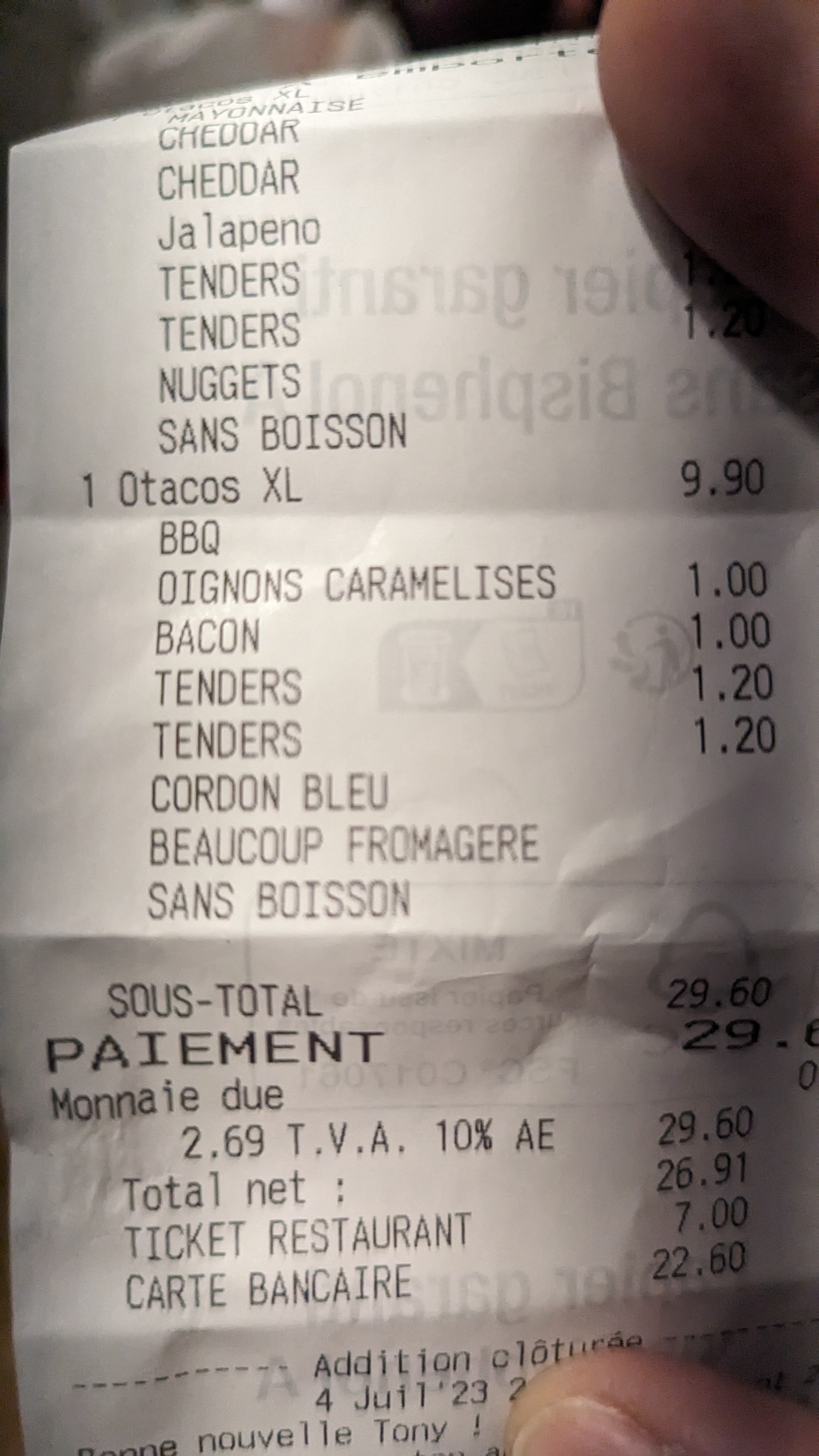 Super comme un bon tacos Seule bémol mais ça viendras avec le temps y a que 2 bornes alors quand y a du monde qui font de grosse commande ça prend énormément de temps et forcément y a pas mal de bruit dans l'attente.