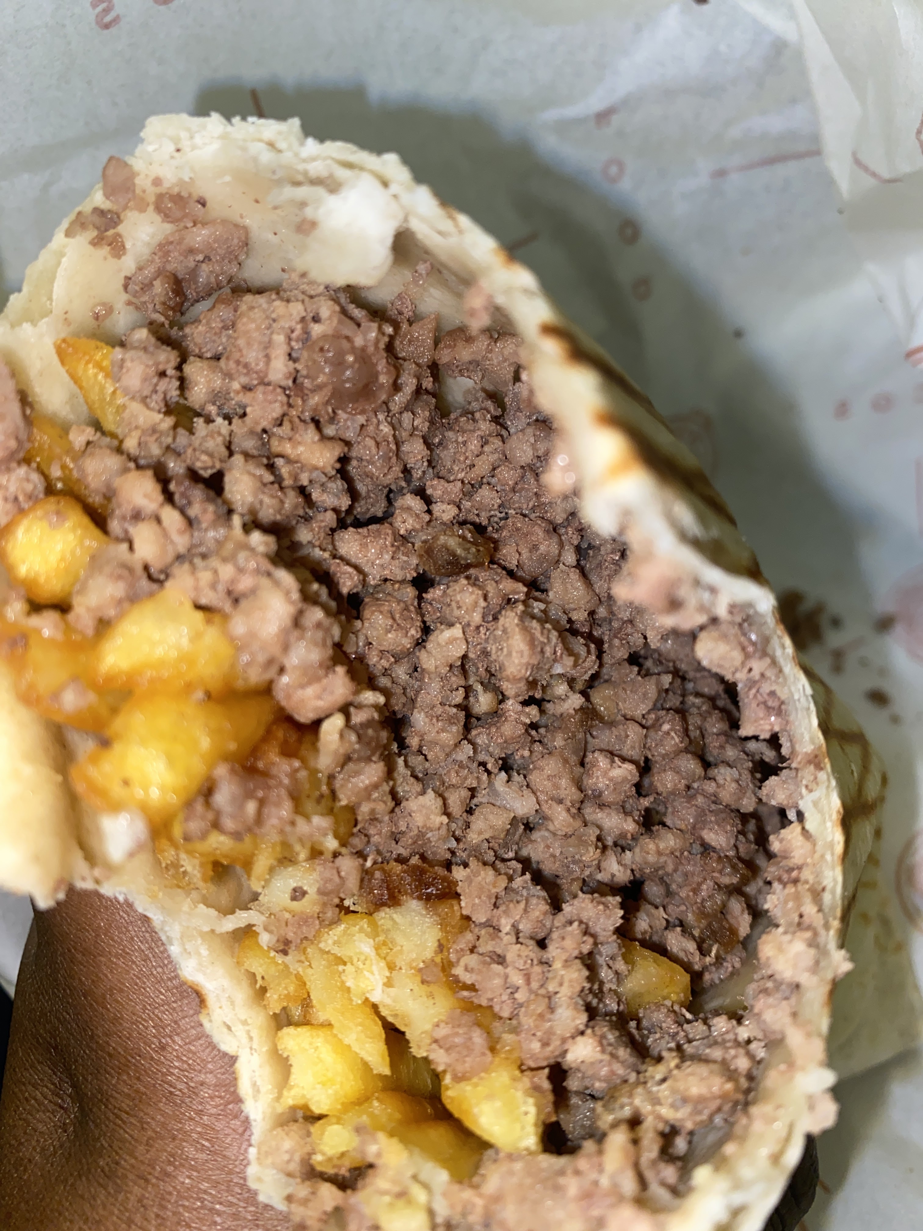 Viande hachée pleine de bout de gras, trop de bœuf dans un tacos L avec 3 nuggets (qui avais un goût pas très bon) pas beaucoup de sauce ni de formage… très déçus je sais pas si c’est le cuisinier qui a changer ou pas mais je suis déçus