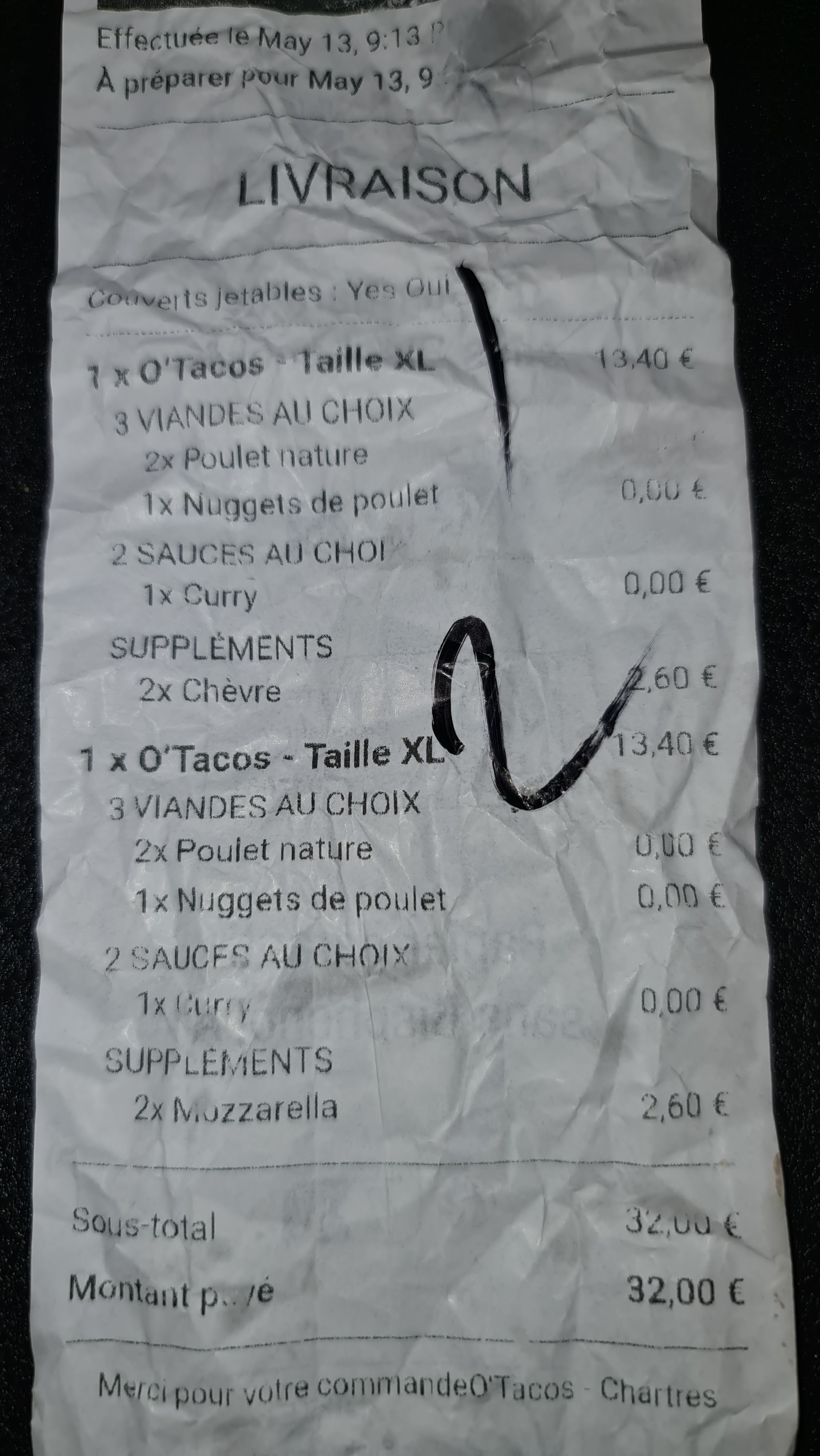 Malgré un problème d'horaire survenu, O'tacos nous ont gentiment proposé un menu gratuit et ont tenu leur promesse. Merci à eux, ils restent mon restaurant préféré sur Chartres 😉