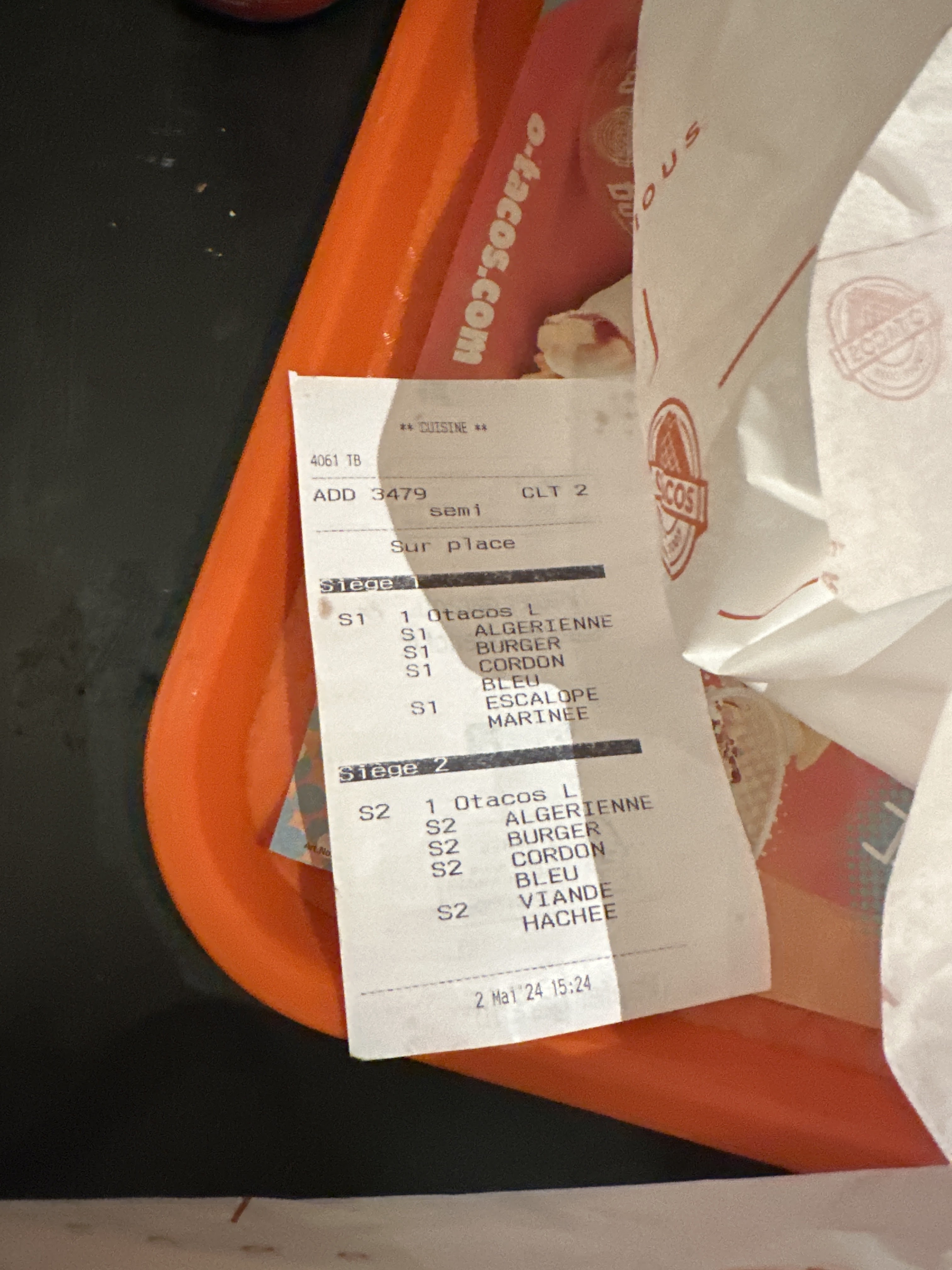 J'ai bien aimé mon tacos au poulet mariné, un des meilleurs que j'ai mangé ! J'ai moins aimé les bipeurs qui sonnent souvent dans le restaurant.