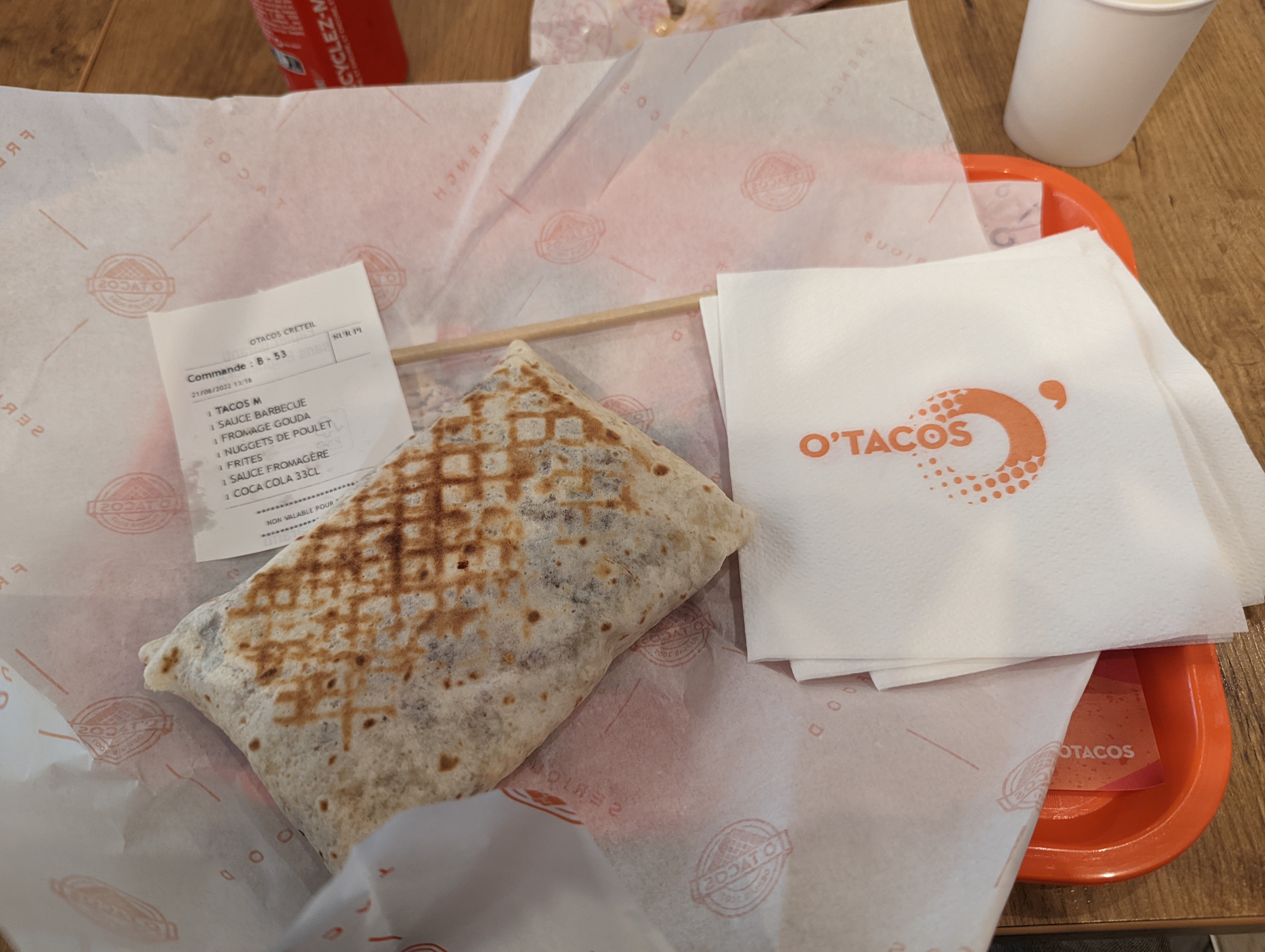J’ai l’habitude de me rendre à cet O'tacos pour prendre la même chose à chaque fois, un M nuggets tout simple, a chaque fois je me régale tout est au top. Sauf cette fois où arrivée au quart de mon tacos je croque dans des morceaux de poivrons… je ne sais pas si en cuisine le miens a été cuisiné sur une surface non nettoyée ou autre mais je n’avais pas demandé ces poivrons, je déteste ça. Résultat : dégoûtée je n’ai pas pu continuer et finir mon repas…