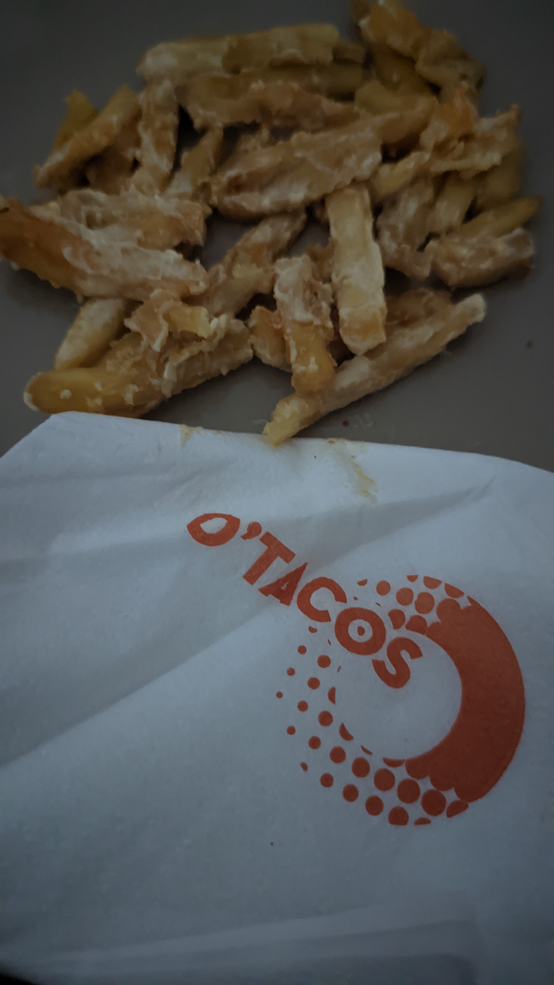 Premièrement, je commande un tacos L je reçois un tacos M. Ensuite je déguste le tacos et il est bourré de frites. Quelques petits morceaux de merguez s’échappent et un petit peu de viande hachée sinon tout le reste c’était des FRITES. Pour finir, très peu de sauce fromagère. En conclusion, mon tacos était très sec et super dur à avaler. Très déçu de ce O’tacos mais aussi de tous les O’tacos en général… les prix augmentent mais la qualité des tacos baissent ??