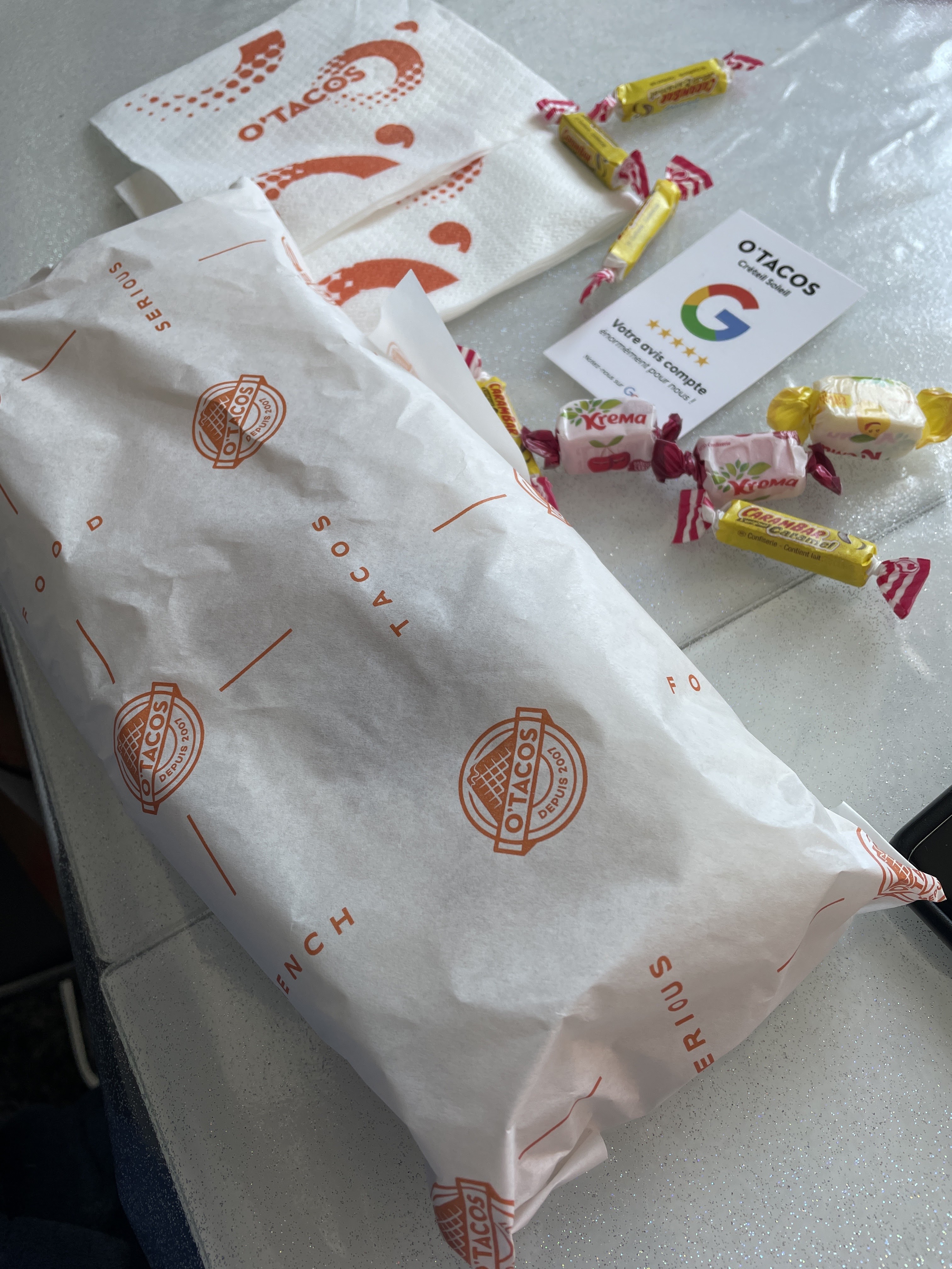 Tacos très bon! Je ne connaissais pas cette enseigne, j'ai passer ma commande avec 2 tenders en plus. Au moment de la réception, j étais étonner de ne pas voir les tenders sur le plateau. Je suis aller demander au serveur ! Les tenders sont dans le tacos..... Bon OK, je ne connaissais pas ! Et 5 mn après, je le vois arriver avec les tenders! En faite ils étaient à part nous nous sommes trompé. Je vous en ai mis un en plus ! J ai trouvé sa correct sans demander un geste commerciale. Il a été fait naturellement ! Top