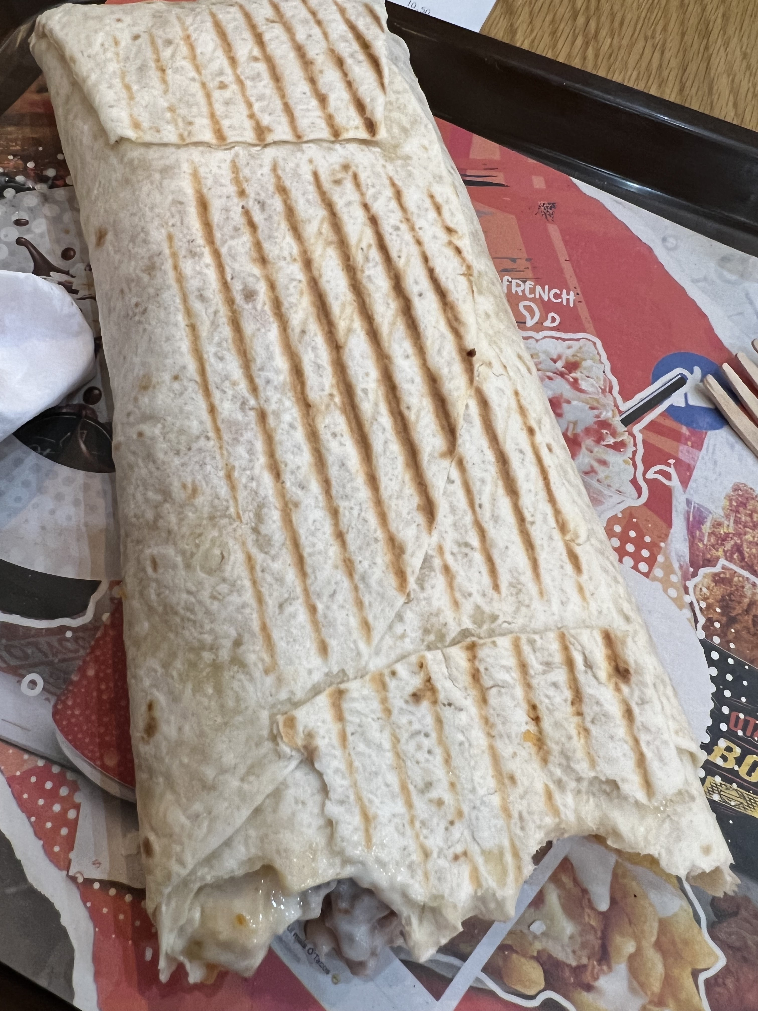 Terrible. Cela nous a été recommandé par un Français local. Je ne comprends pas le battage médiatique. Wrap de tortilla moelleux rempli de choses qui ne doivent pas se mélanger et d'une sauce au fromage très crémeuse. Goût assez fade malgré les nombreux ingrédients. Il vaut mieux aller chez McDonald's si vous voulez un repas pas cher.